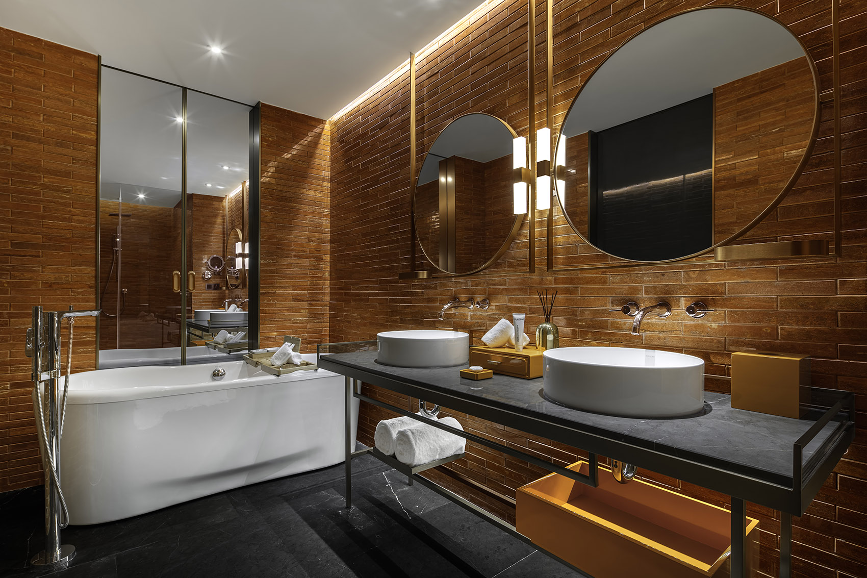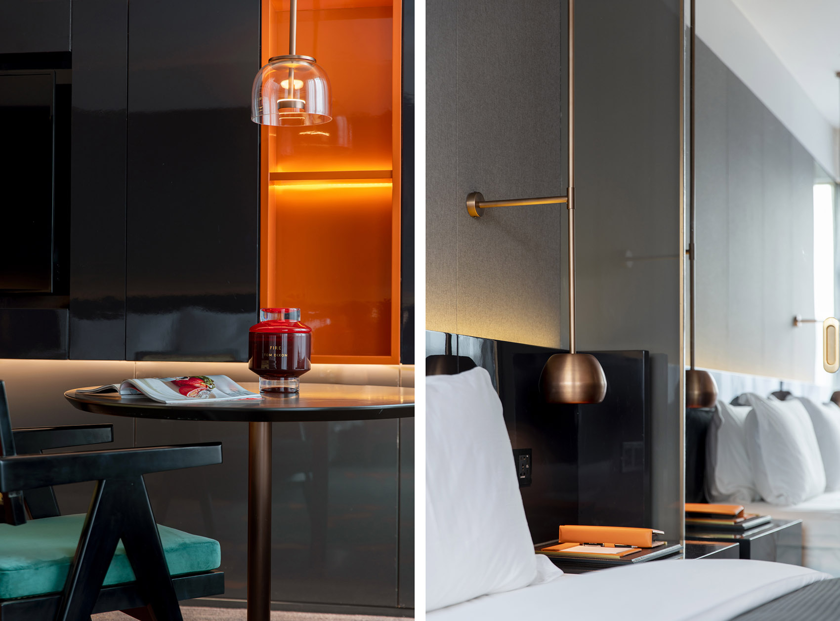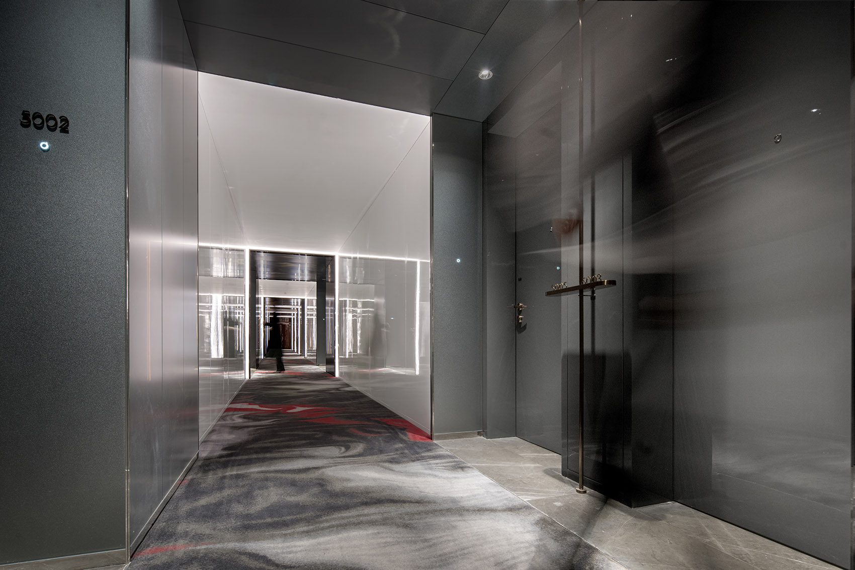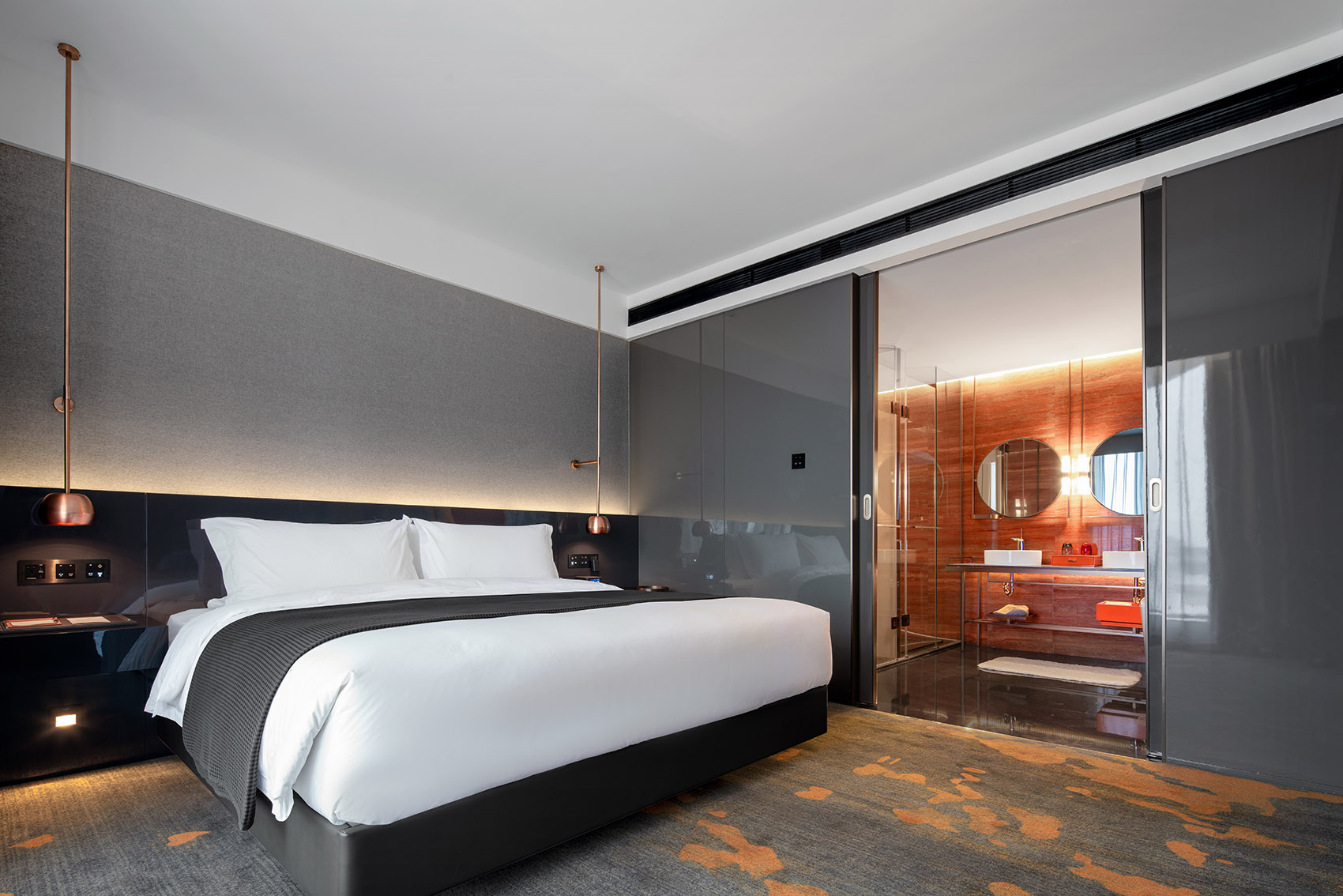 Linow 独有的品牌色——亮金色贯穿于整个设计,在雅致的客房走道中跳脱出活力与时尚,为宾客带来一种积极美好的生活向往。酒店客房处处可见设计心思,精雕细琢的室内设计,配上定制家具,丰富多样的质感和壁饰,有如为每间房间编织出一个触觉绣帷。