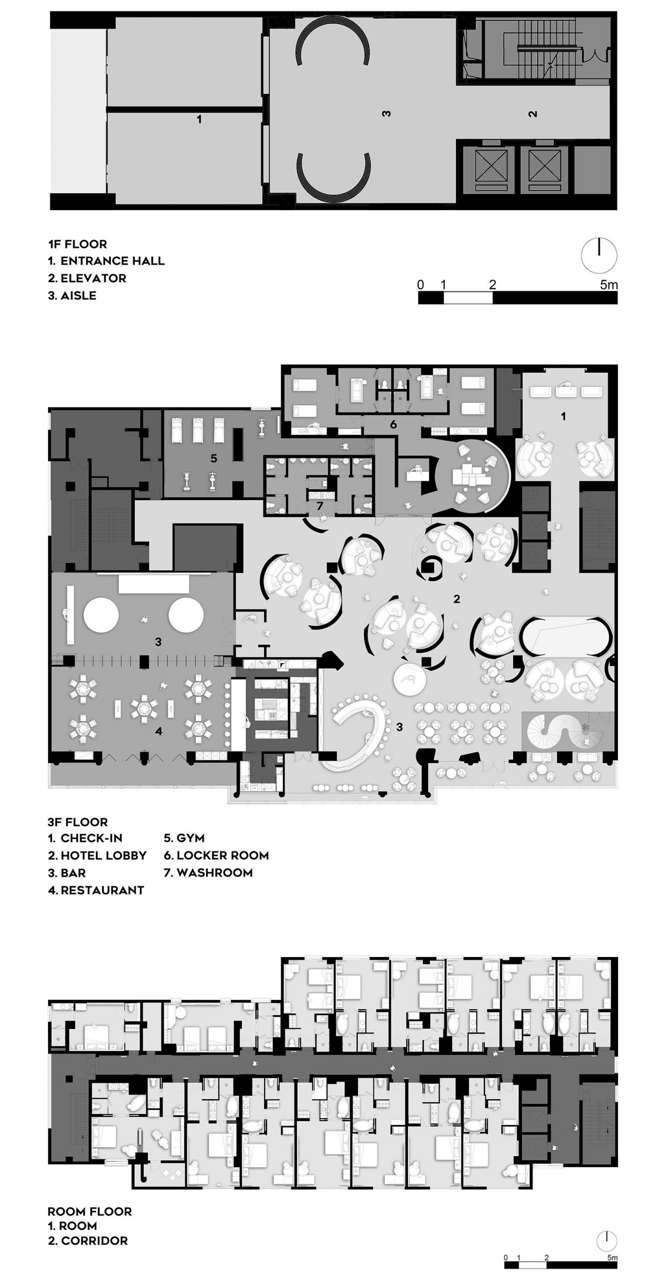 酒店三层,整合了酒吧、餐厅、接待、健身、休闲等多元功能,通过动线的梳理,形成互不干扰的空间格局,而不同空间中以材质的切换,制造不同的空间体验,砖墙的元素以不同的形式贯穿始终,串联起空间的记忆。