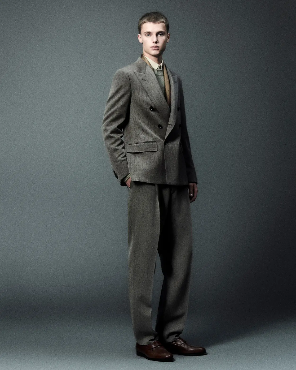 Loro Piana 在其百年之际大力发展面料和传统,该系列重视纤维面料与形状轮廓,同时也重在彰显低调静谧的奢华氛围。典型的 Loro Piana 男士偏爱舒适和轻松,而非多余而累赘的装饰,无论是超柔软蜂蜜色羊毛外套搭配同样触感极佳的长裤和象牙色羊绒袜,还是野战夹克、飞行员夹克和多口袋背心搭配精致针织品或是羊毛毛皮衬衫式夹克,Loro Piana 男士总在俊逸洒脱间充盈知性贵气。值得关注的单品还有低调而修身的牛仔布系列如棉质休闲裤和单宁夹克;晚装系列也别错过,包括单排扣和双排扣燕尾服以及毛绒羊毛大衣,搭配丝绸高领和 Piana 标志性的立领 Spagna 衬衫,无需打领结就能凸显高级。