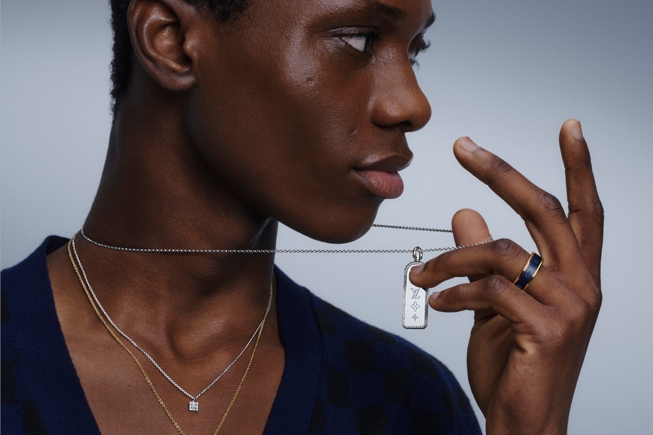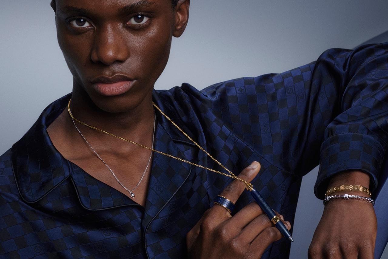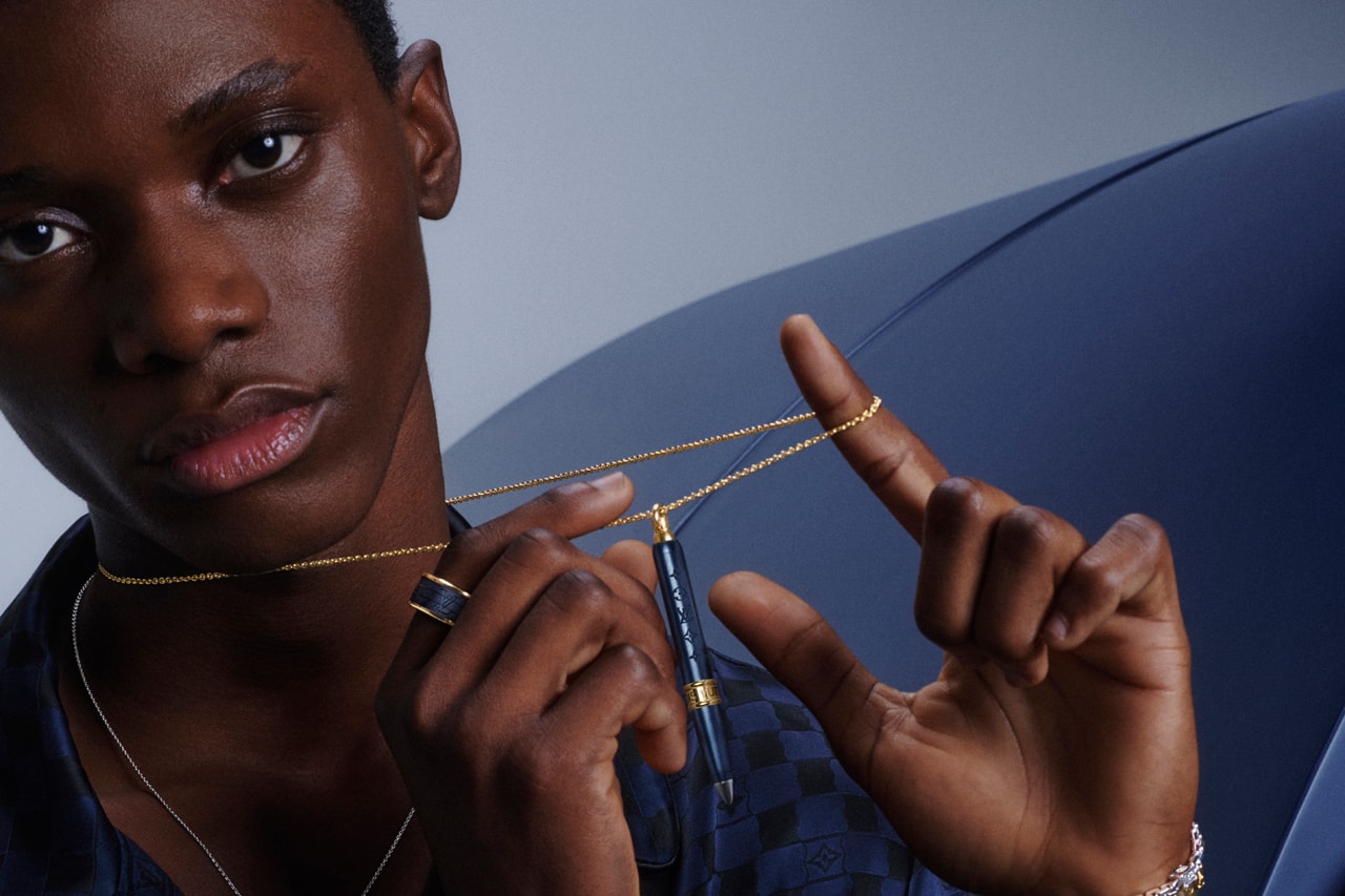 Les Gastons Vuitton 男士高级珠宝系列单品包括吊坠、戒指、古巴链式手链、吊牌项链和耳环,以深蓝色钛金属、白金和钻石等材质制成,其灵感均源自 Gaston-Louis Vuitton 的个人特质与 Louis Vuitton 历史。比如 Louis Vuitton 中频频出现的牛仔布和钴蓝色调,让 Louis Vuitton 珠宝艺术总监 Amfitheatrof 为 Les Gastons Vuitton 系列开发了深蓝色钛金属,向原始靛蓝致敬,同时也向经典衣橱中的蓝色单品致敬。Gaston-Louis Vuitton 曾经也频繁自称“almost born in a trunk”,让 Amfitheatrof 以此为灵感创作出了 Louis Vuitton 经典旅行箱的手链。同时钛金属钢笔的吊坠设计则致敬了 Gaston-Louis Vuitton 在笔记本上不断记录他的想法、设计和草图的习惯。