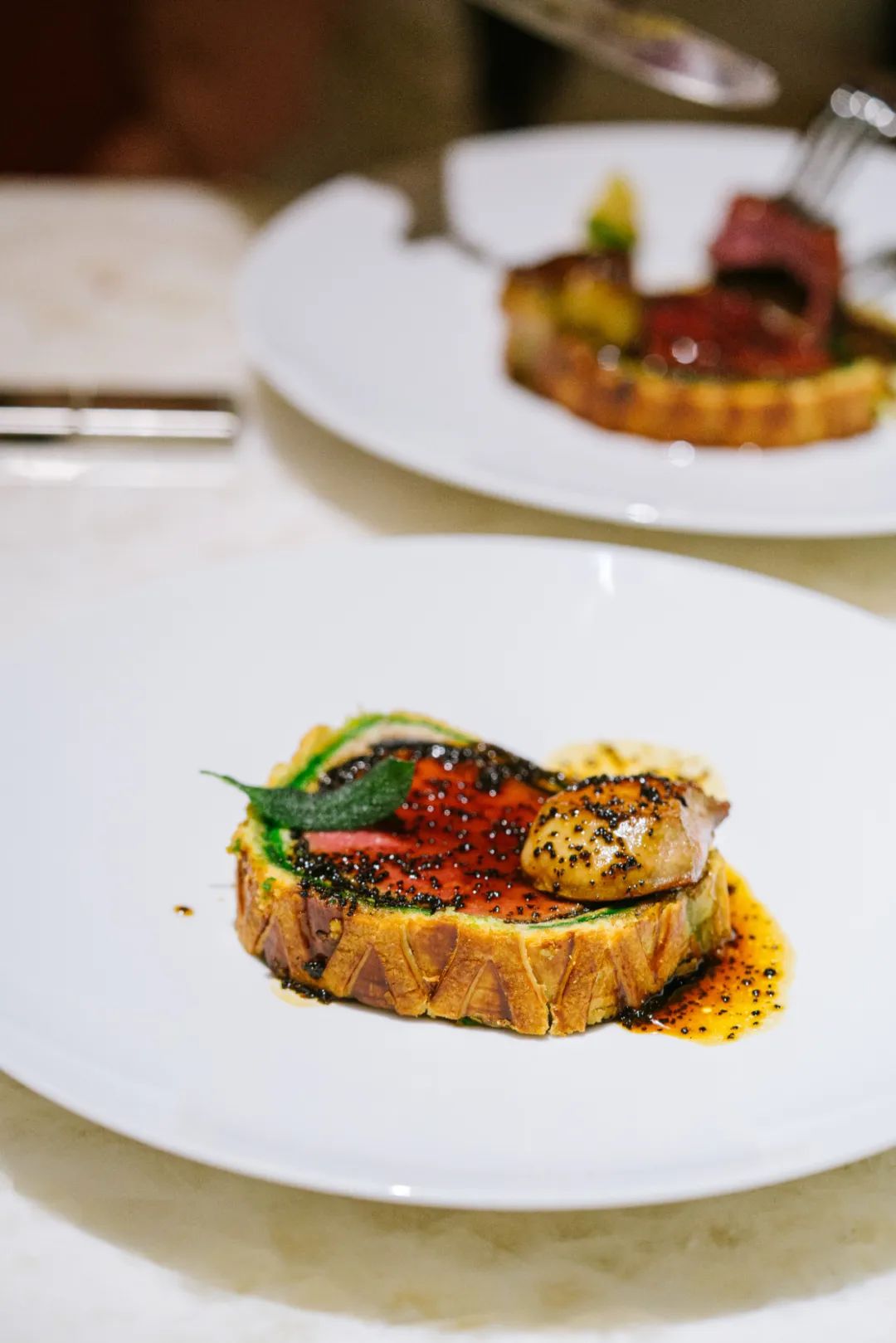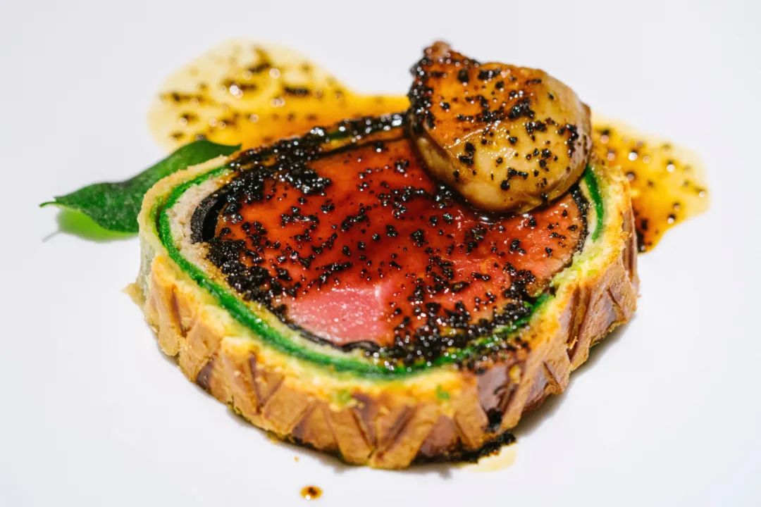 比一般惠灵顿更多层数、酥皮、香草、肝酱、松露……酱汁也用到了四川本地黑松露,五成熟的牛肉上再加一块淌着油的煎肥肝!