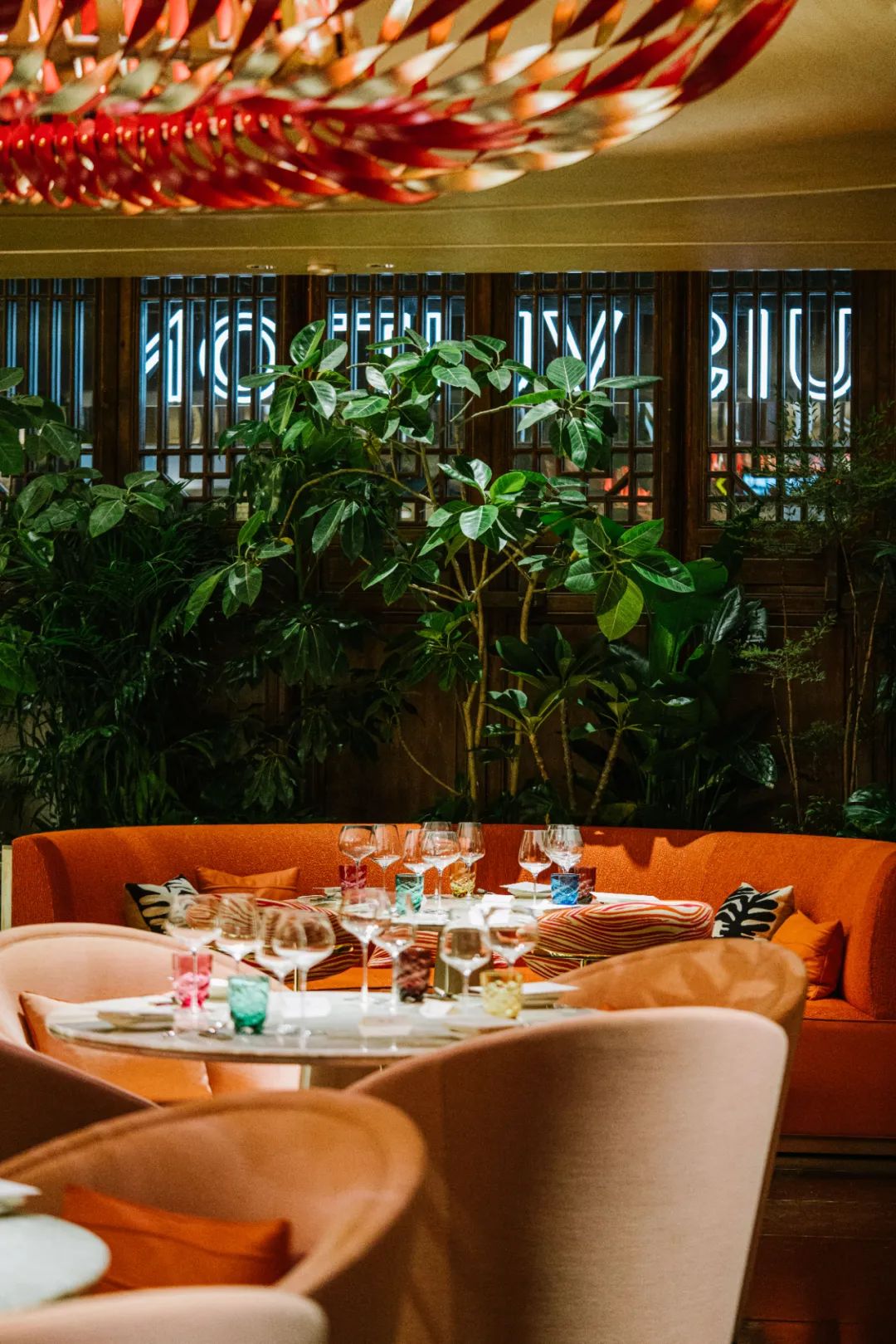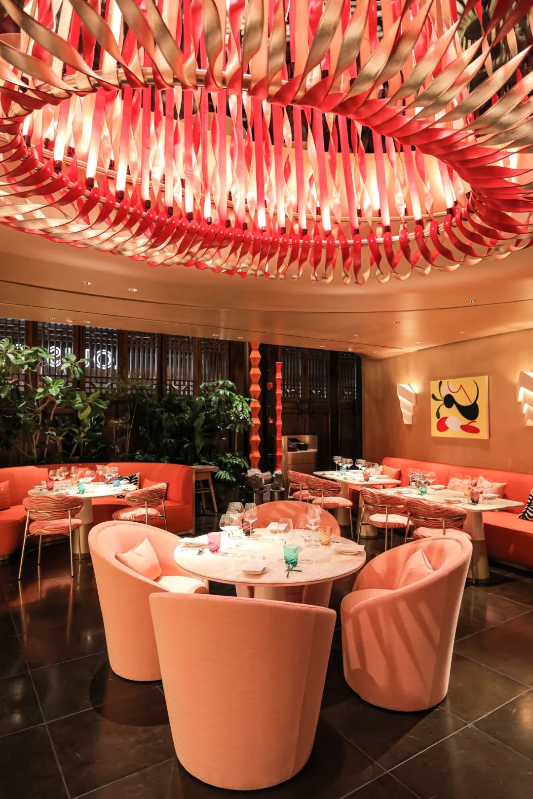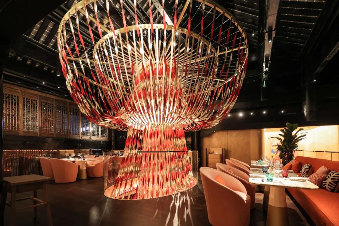 整间餐厅的视觉中心,是由 atelier oï 设计的珊瑚色皮革吊灯,店员说造型灵感来自四川火锅,我说这个火锅可怎么看都像老北京铜锅呀……