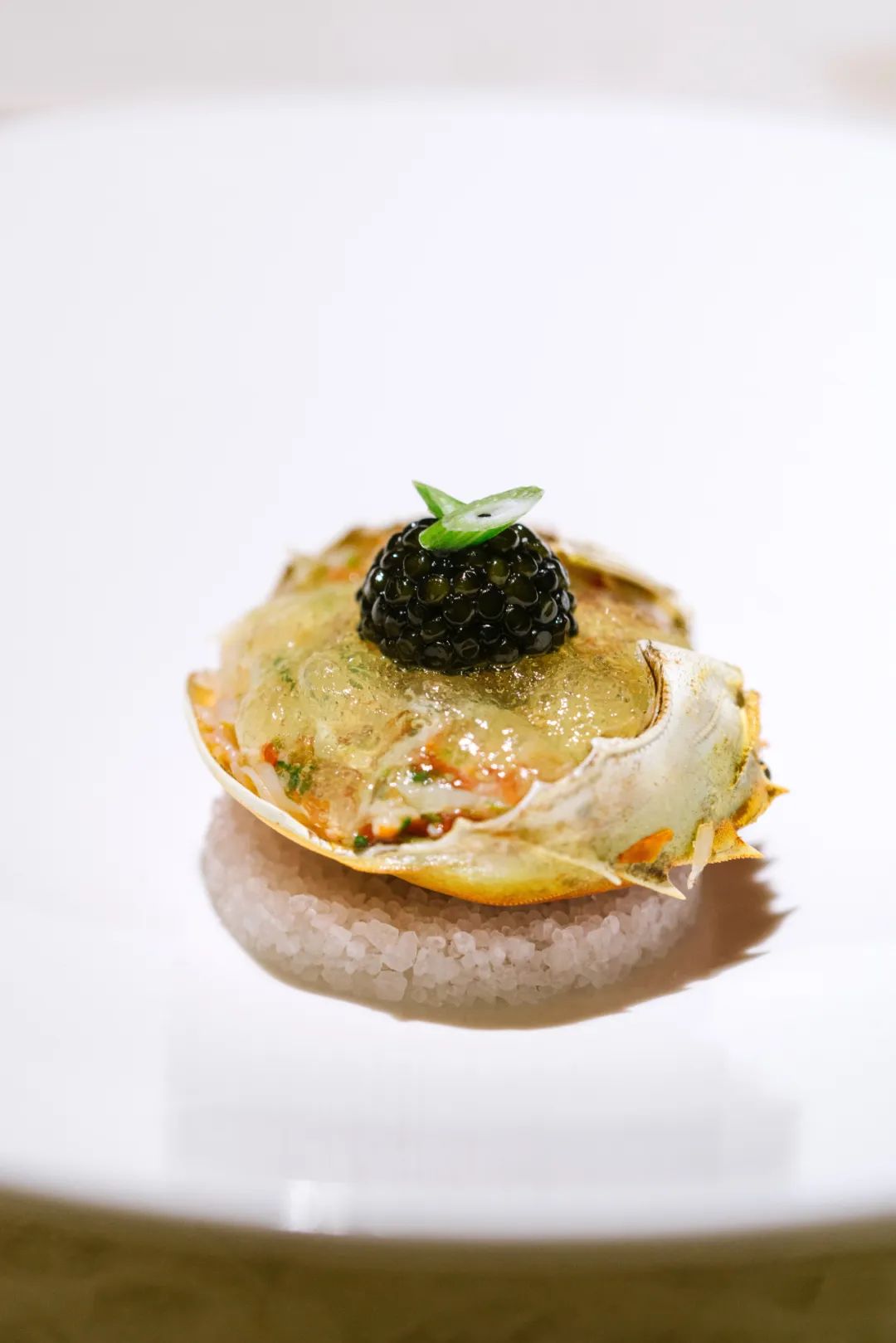 釀在蟹壳里的雪蟹肉,配了柠檬啫哩和鱼子酱,勺子往下 Kuai 还有番茄和牛油果慕斯。