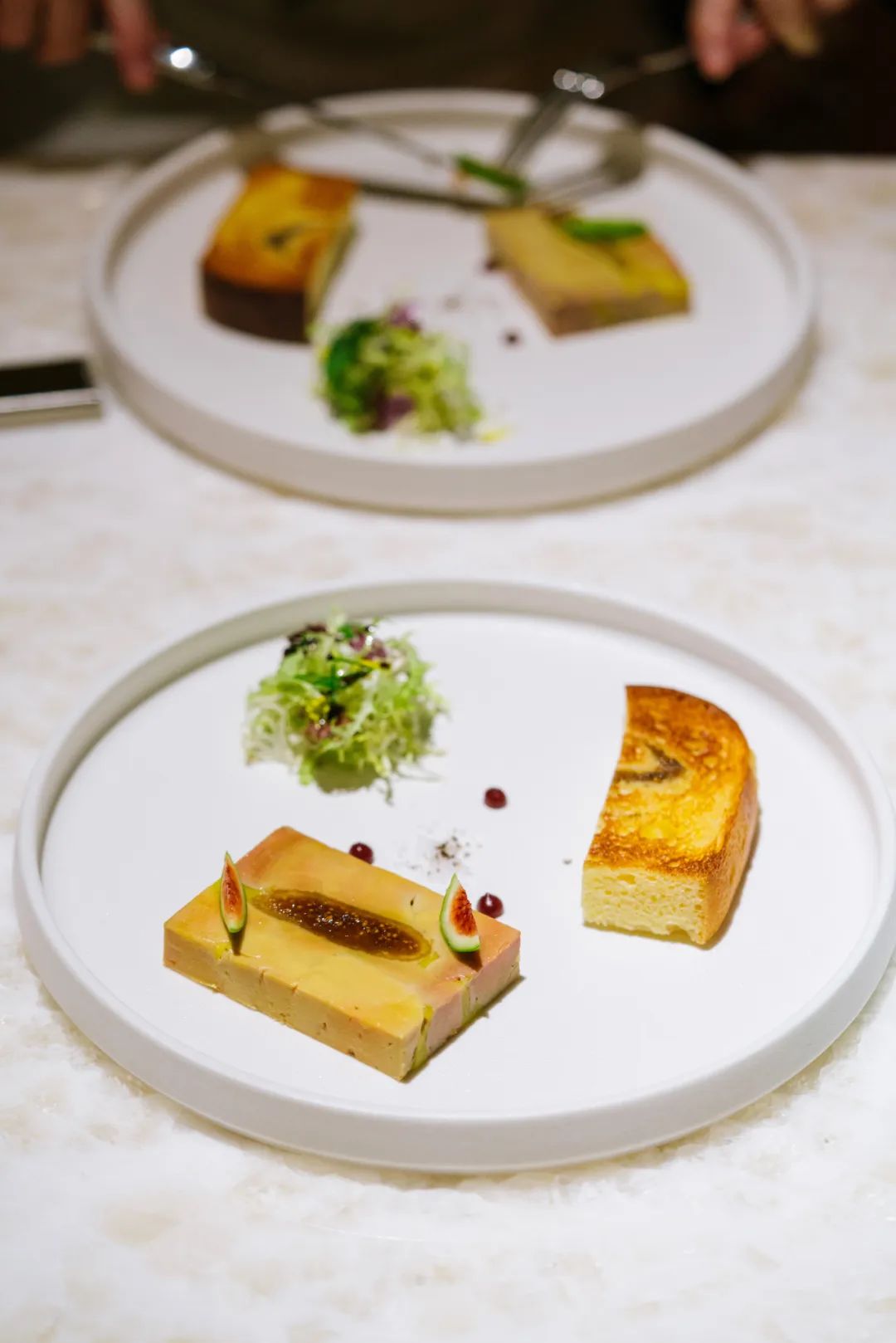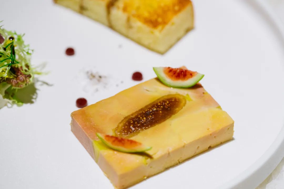 而且故意没有打到特别细,保留了一些肥肝原本的质地,中间镶入糖渍无花果,抹在烤吐司上吃,有咸甜交叠的爆脂口感。