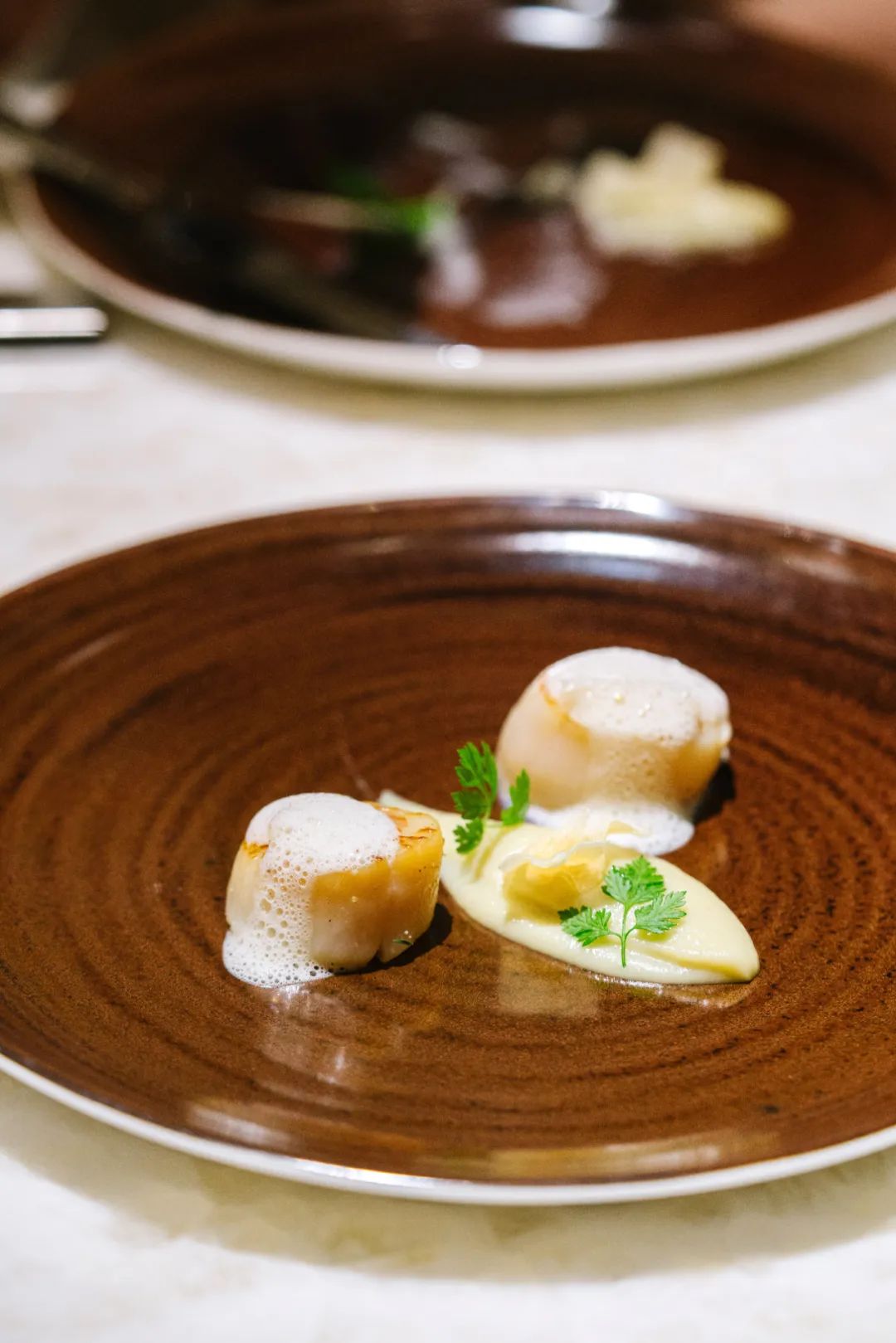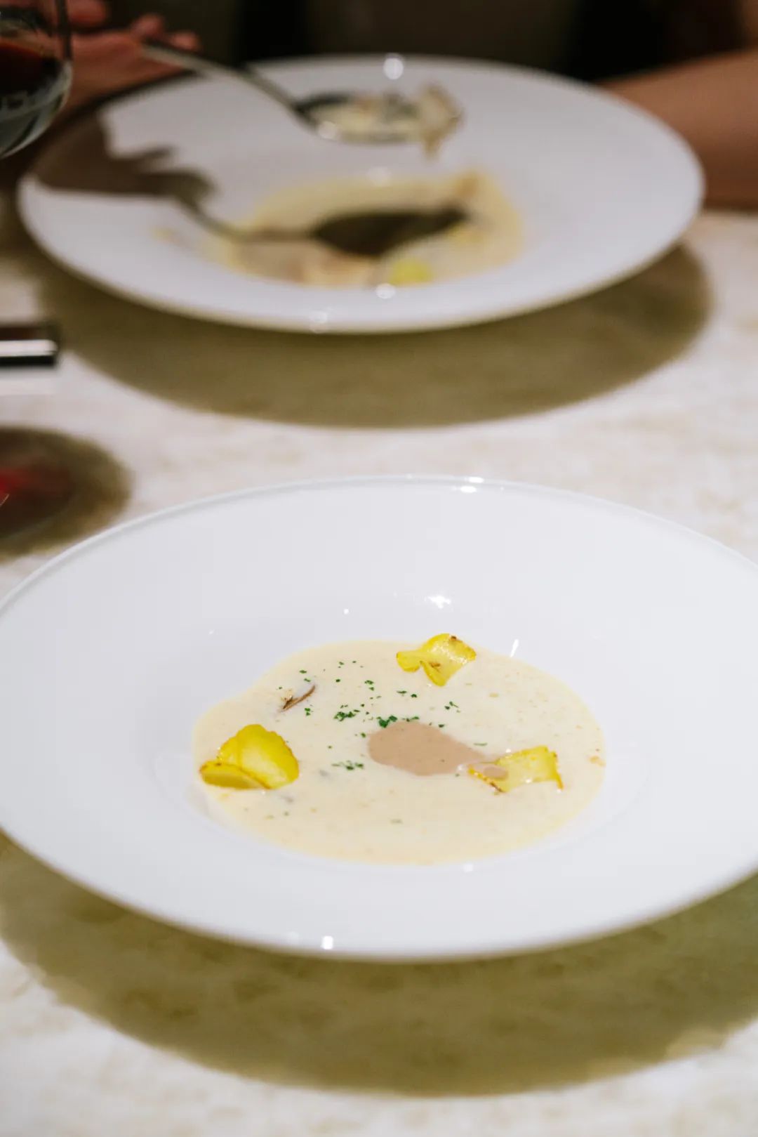 香草栗子浓汤,调入了波本酒的甜味以及培根泡沫的咸香。