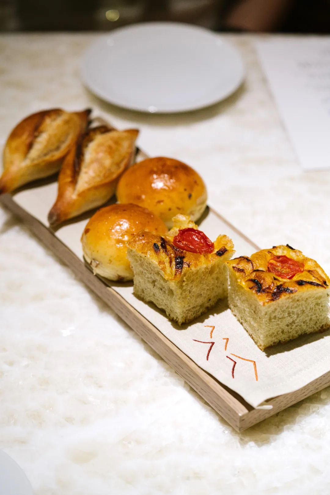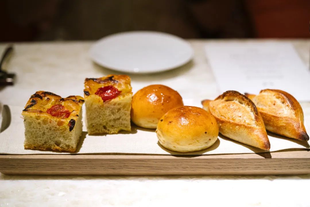 餐前面包盘,一共三款——意大利的佛卡夏、苏格兰的小软包、法国的小法棍。