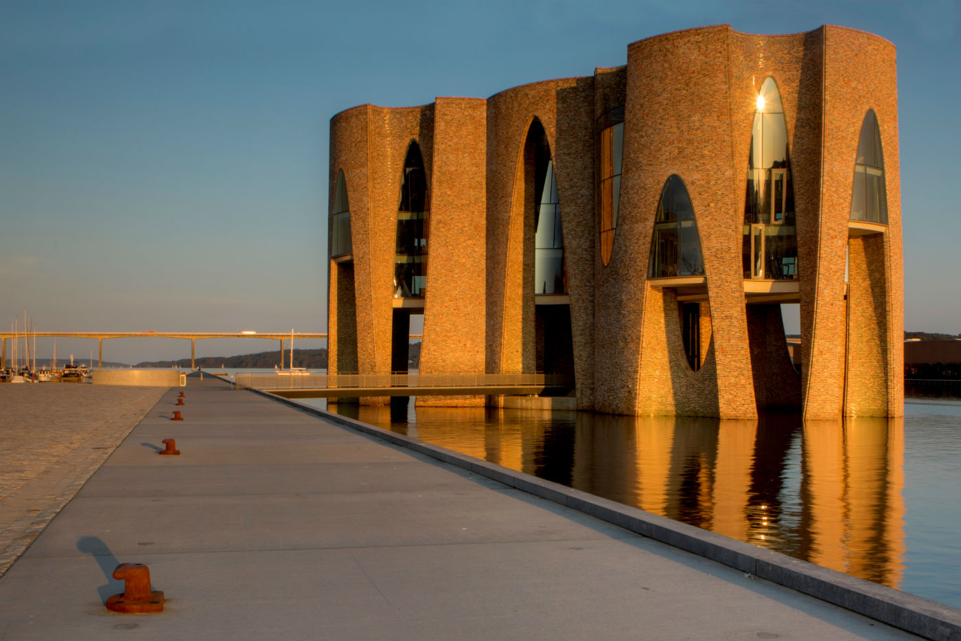 在开放式的露台上,可以一览无余的欣赏到 Vejle Marina 码头的美丽景色,客人们也可以围在这里烤火。弯曲的建筑外立面,留给人们巨大的想象空间。