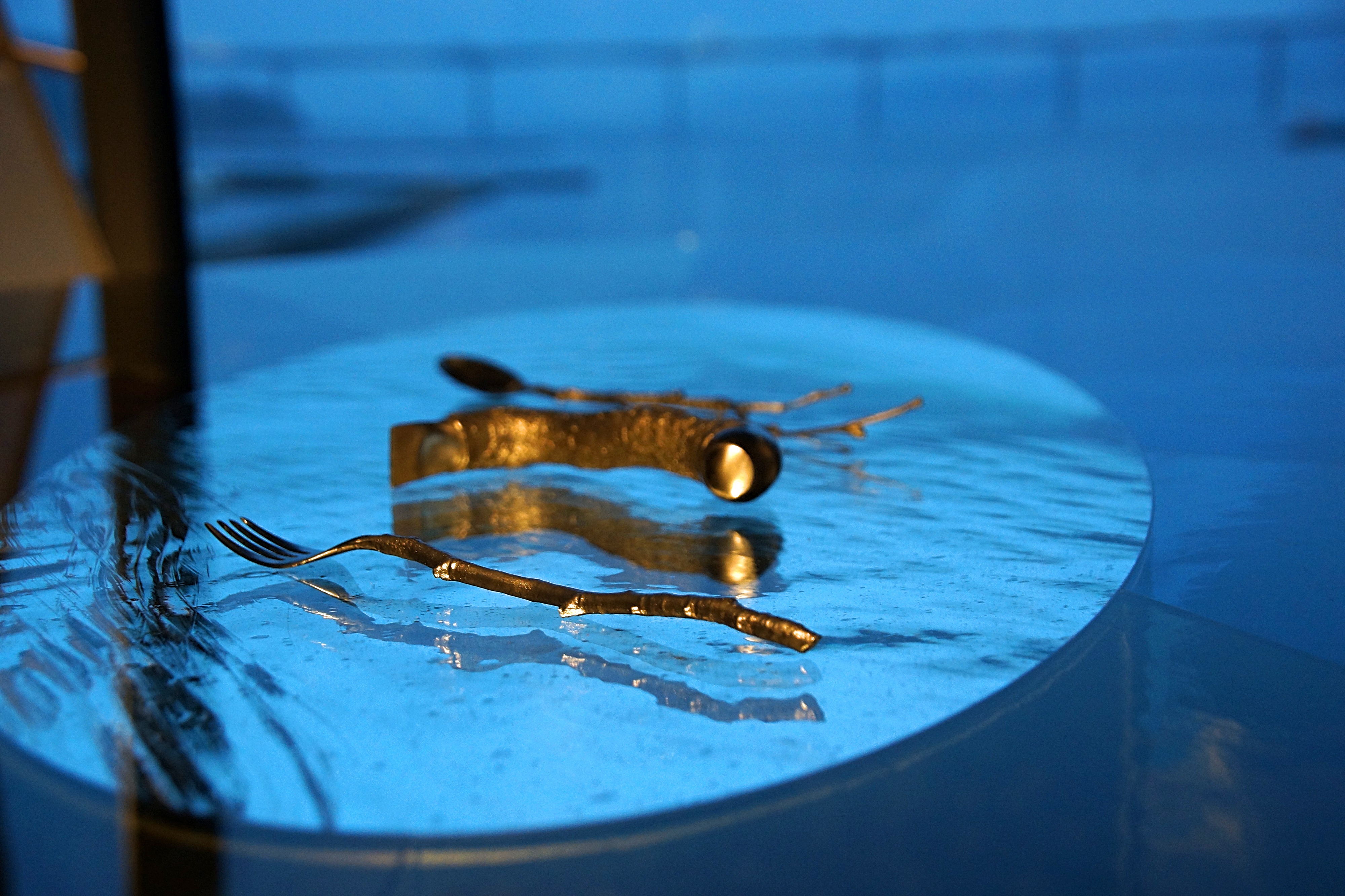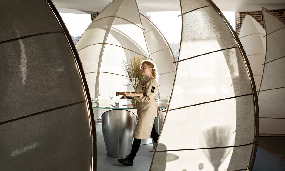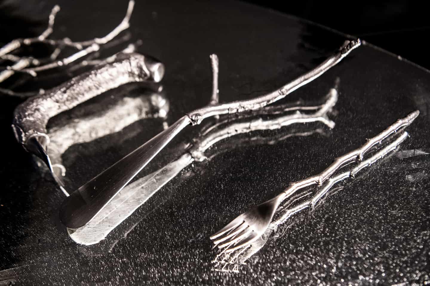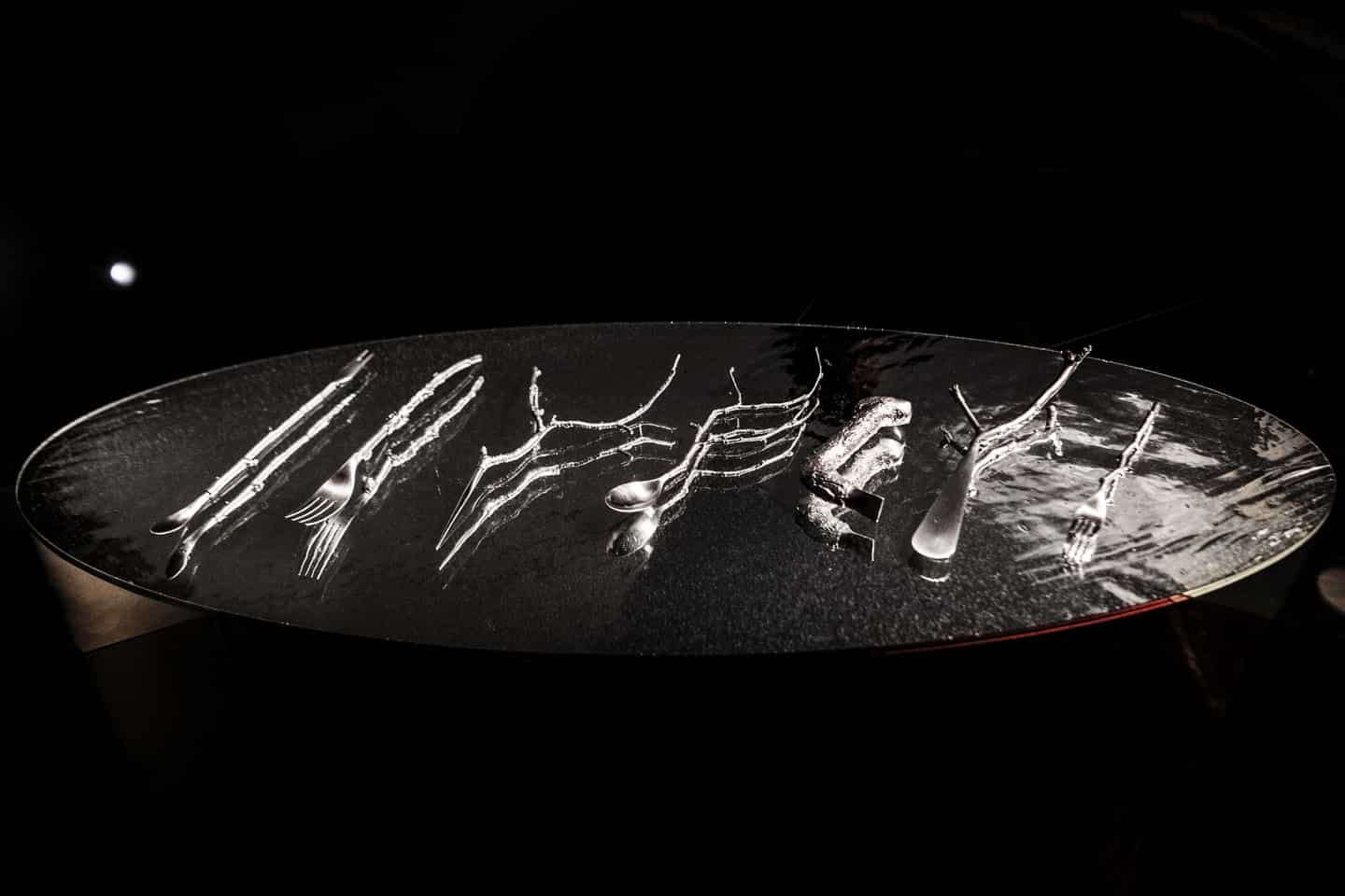 餐厅内的餐具也是精心制作而成,餐厅老板 Morten Kirk Johansen 在周围的森林中收集了一些树枝,送到柏林的 Olafur Eliasson 工作室里。由 Eliasson 和 Behmann 挑选出可以用作餐具的细枝,最后用钢制作而成。在这座艺术殿堂内品尝美食,想必也是一次难忘的体验了。