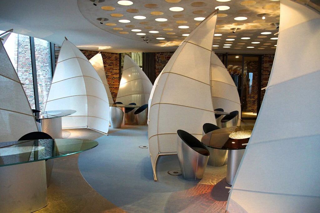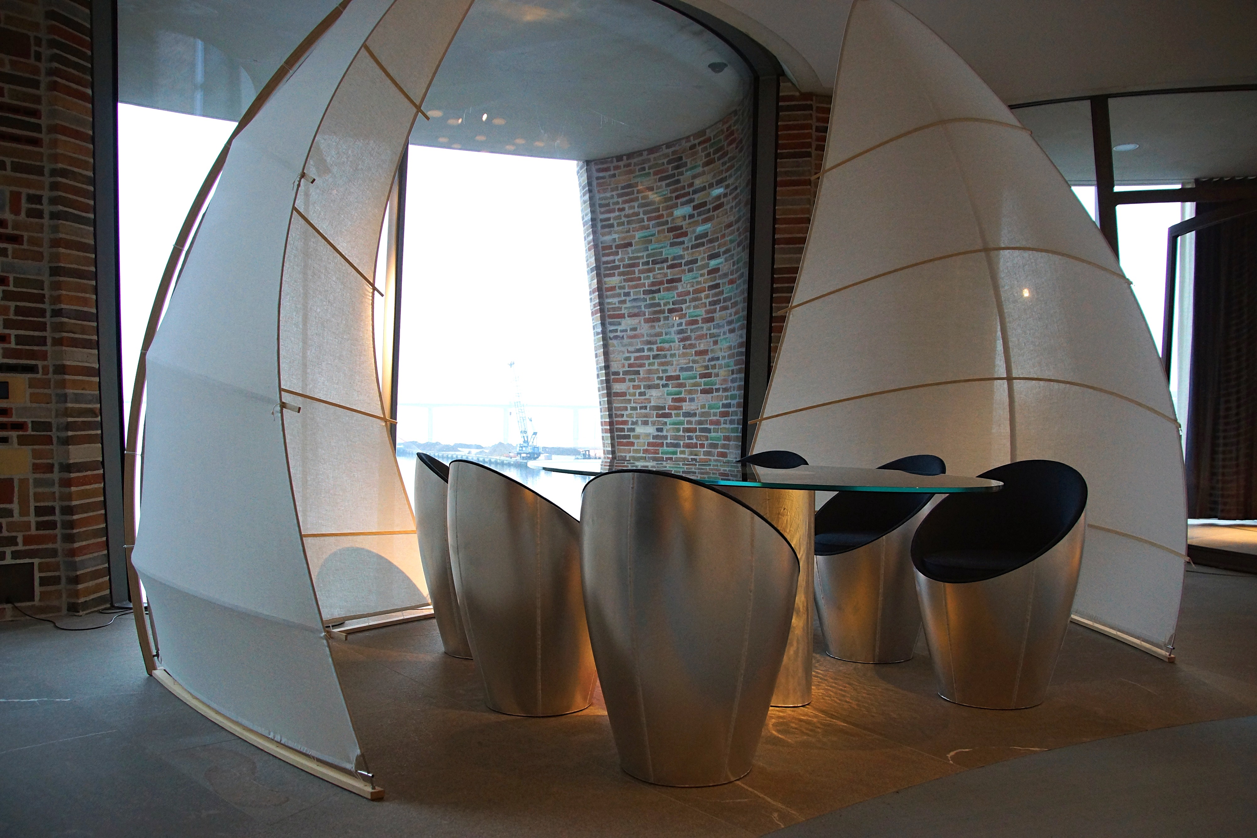 餐桌周围的帆照应着码头的船帆,在阳光好的时候,还会呈现出通透的光影效果。