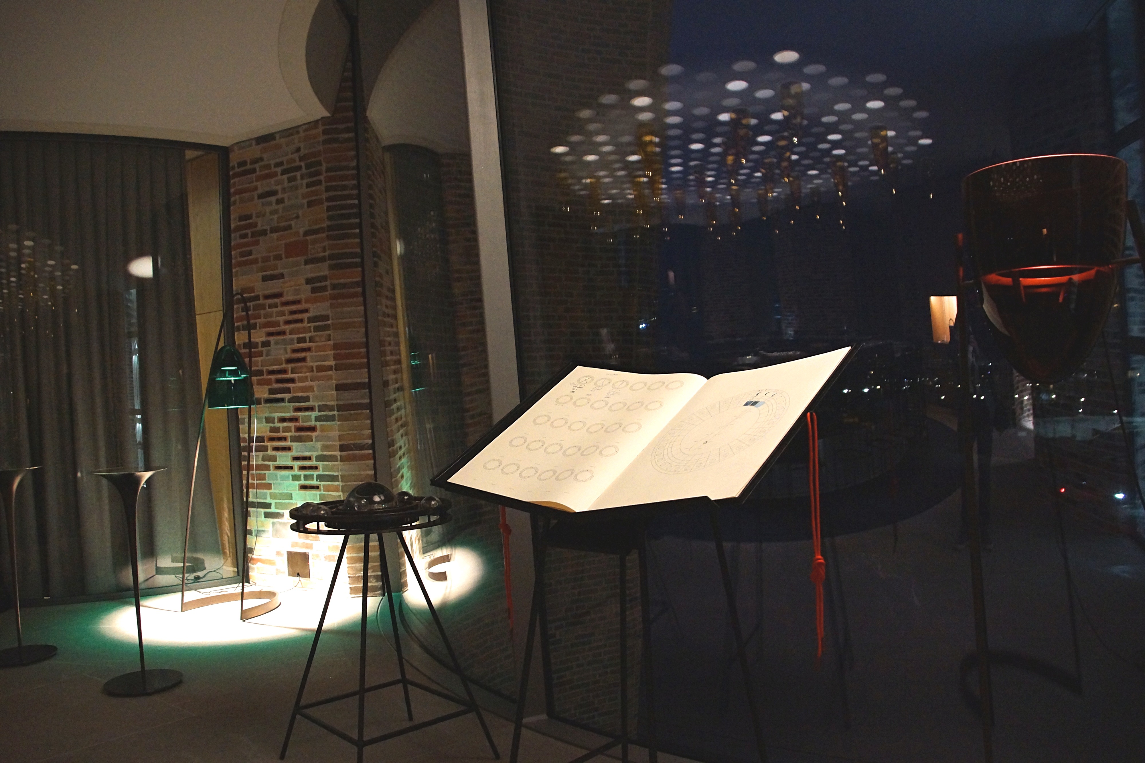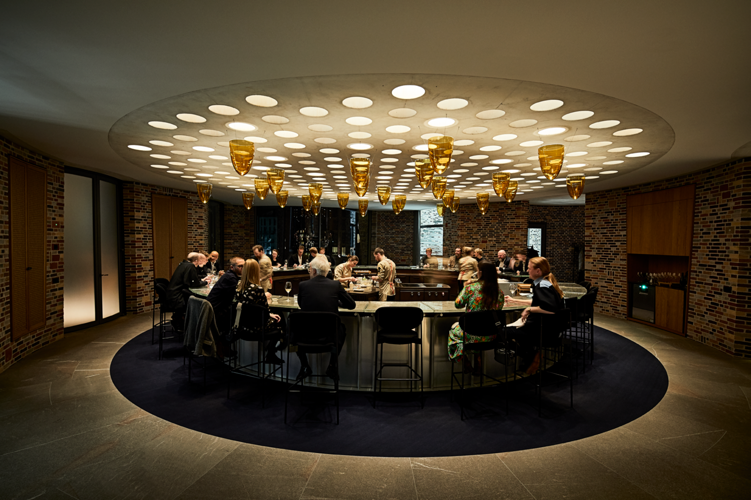 天花板上的灯光宛如夜空中的星星,点亮了整个区域。餐厅内还有一间酒吧,巨大的圆形吧台占据了整个空间。复古的砖墙搭配棕黄色的灯光,营造出静谧的氛围。