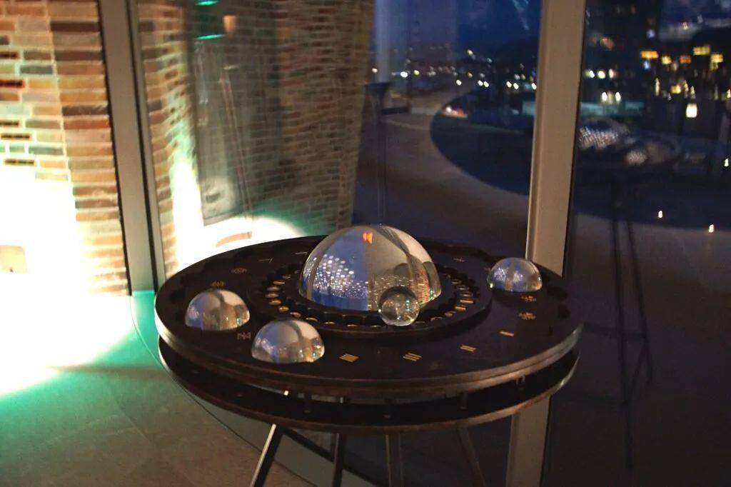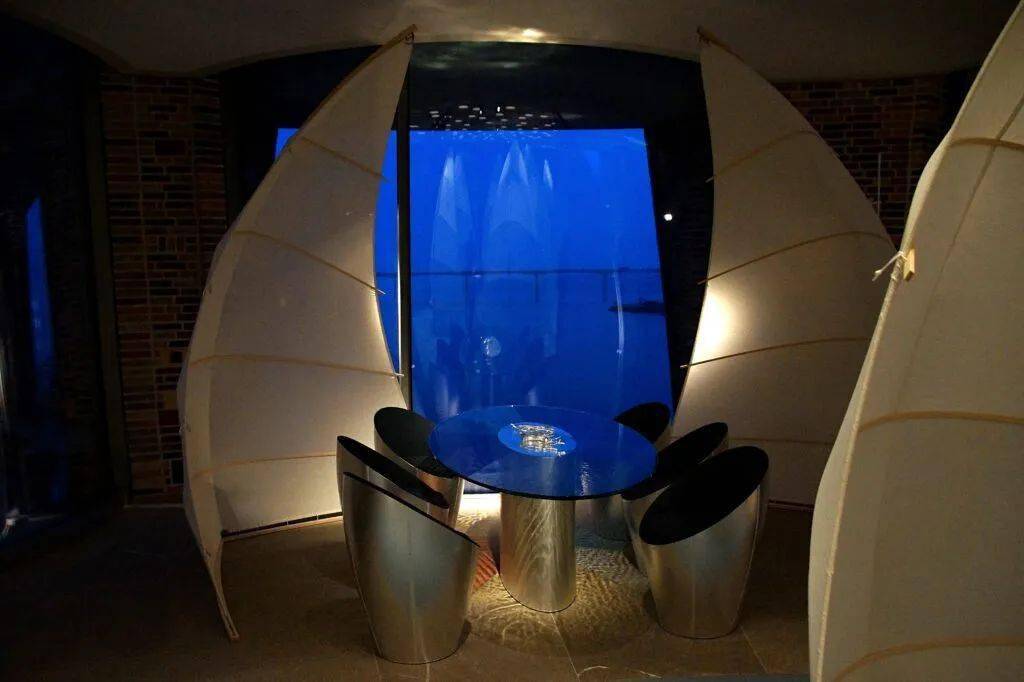 夜晚又能让人仿佛置身平静的海面,多彩的玻璃桌面透过光线在地面留下美丽的倒影,好似波光粼粼的海面。
