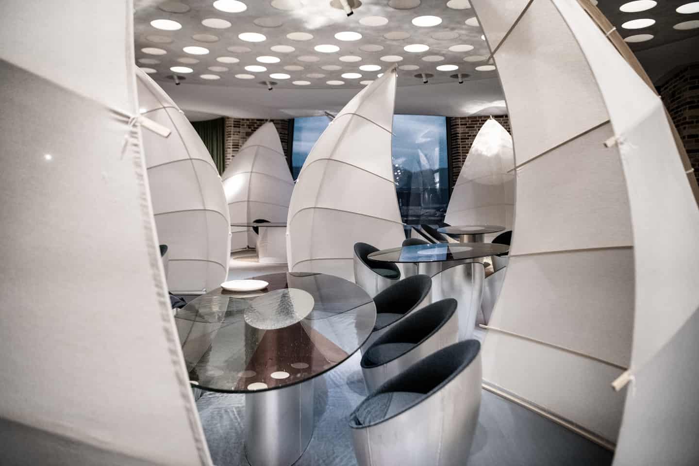 而在餐厅内部,Eliasson 负责设计了所有内饰,包括家具、照明以及厨房用家具,真正的将美食、艺术和建筑融为一体。像船帆一样的隔断、形如浮标的椅子......处处都是惊喜。