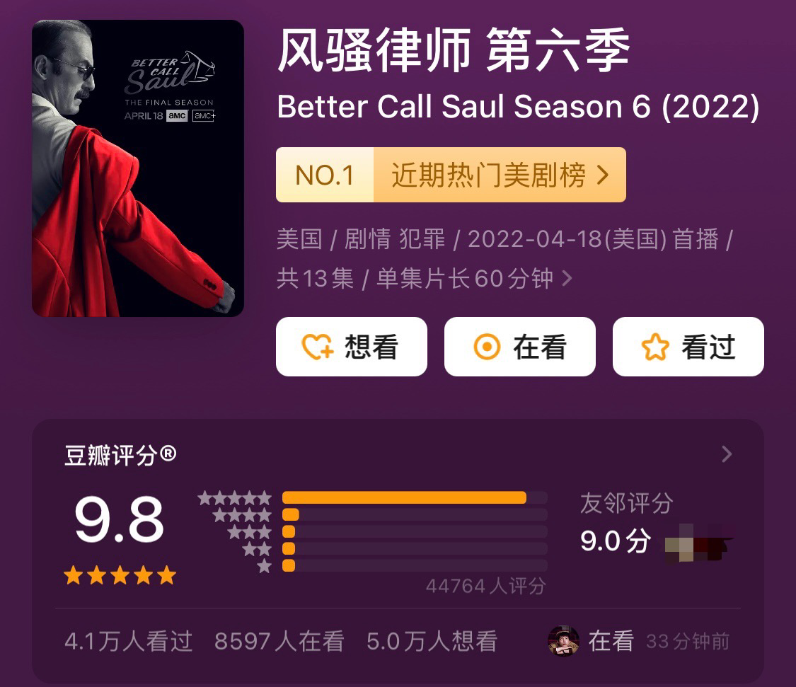 作为已经被奉为神作的《绝命毒师》的衍生剧,《风骚律师》的口碑表现甚至比正传还要更胜一筹——在豆瓣上,最终季的评分已经达到了9.8,接近满分。