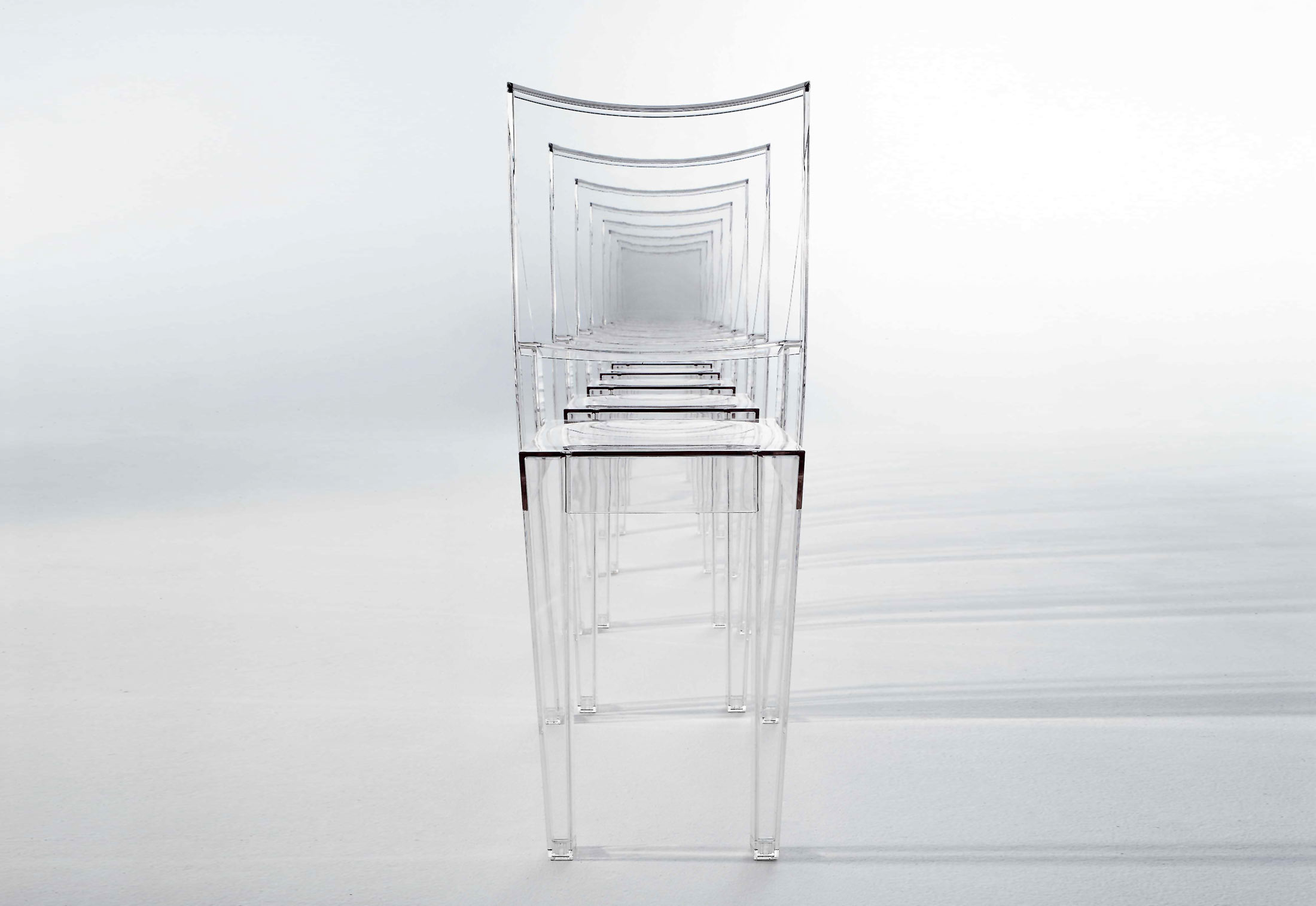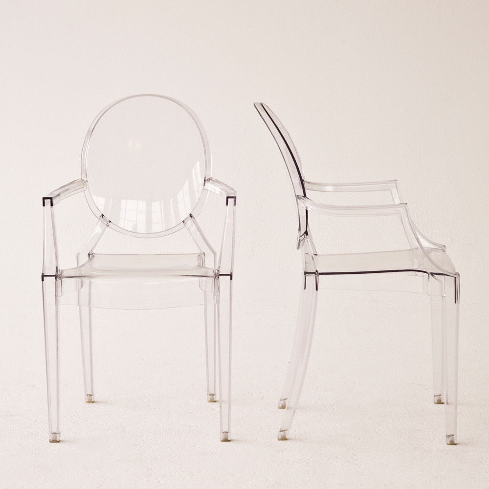 今天的我们依然可以看到很多Kartell设计的新经典。图一:Kartell开发出聚碳酸酯,做出了世界第一把全透明的椅子La Marie; 图二:Philippe Starck设计的路易幽灵椅,从法国路易十五时期经典的巴洛克风格扶手椅改造而来,各种线条和几何形状是一次注塑成型的,透明聚碳酸酯材料让它看上去像幽灵一样若隐若现; 图三:幽灵椅无扶手版本Victoria Ghost Chair。