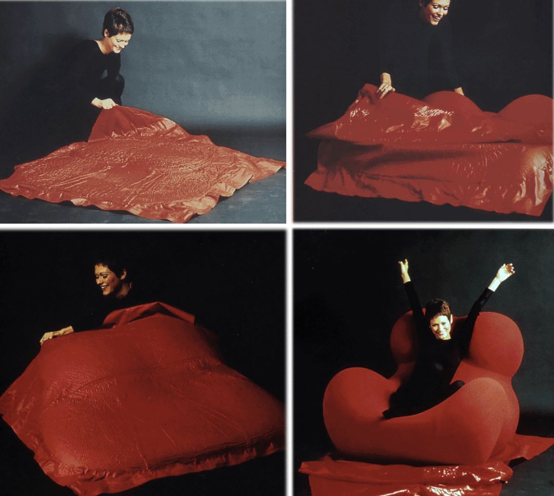 Up使用了真空压缩的聚氨酯制成,打开前的体积只有展开后的1/10。由于聚氨酯混合物中含有氟利昂气体,家具一经拆封便立即成形,这是一个不可逆的过程。上图展示了Up产品买来后展开的一系列变化。