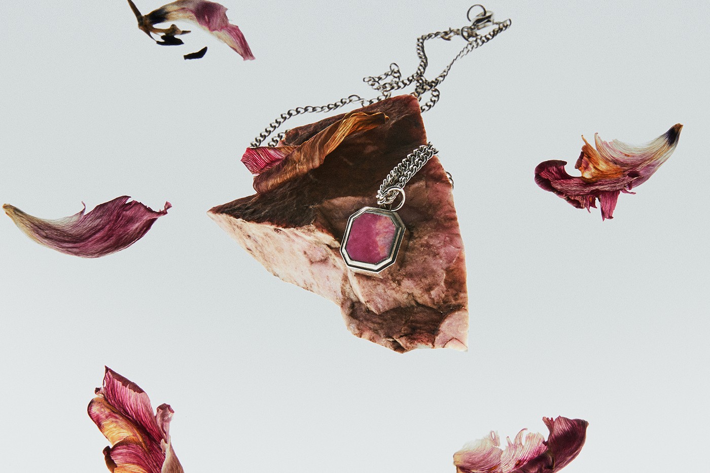 饰品由可持续的 .925 银制成,每一款均提供两种独特版本可选,即 Chrysanthemum Stone (花石)与 Rhodonite 蔷薇辉石版本。其中花石原产于温哥华和日本的部分地区,花色呈灰调,呈花瓣状长石晶体形态,这对 Maple 和 wings+horns 来说,象征着和谐、变化和进步。蔷薇辉石则是在不列颠哥伦比亚省发现的另一种宝石,呈现为玫瑰色和粉红色,散发着平静田园风情,也暗示着当地不思议的自然奇观,据悉这种宝石代表着过去与现在之间关系的不断平衡。