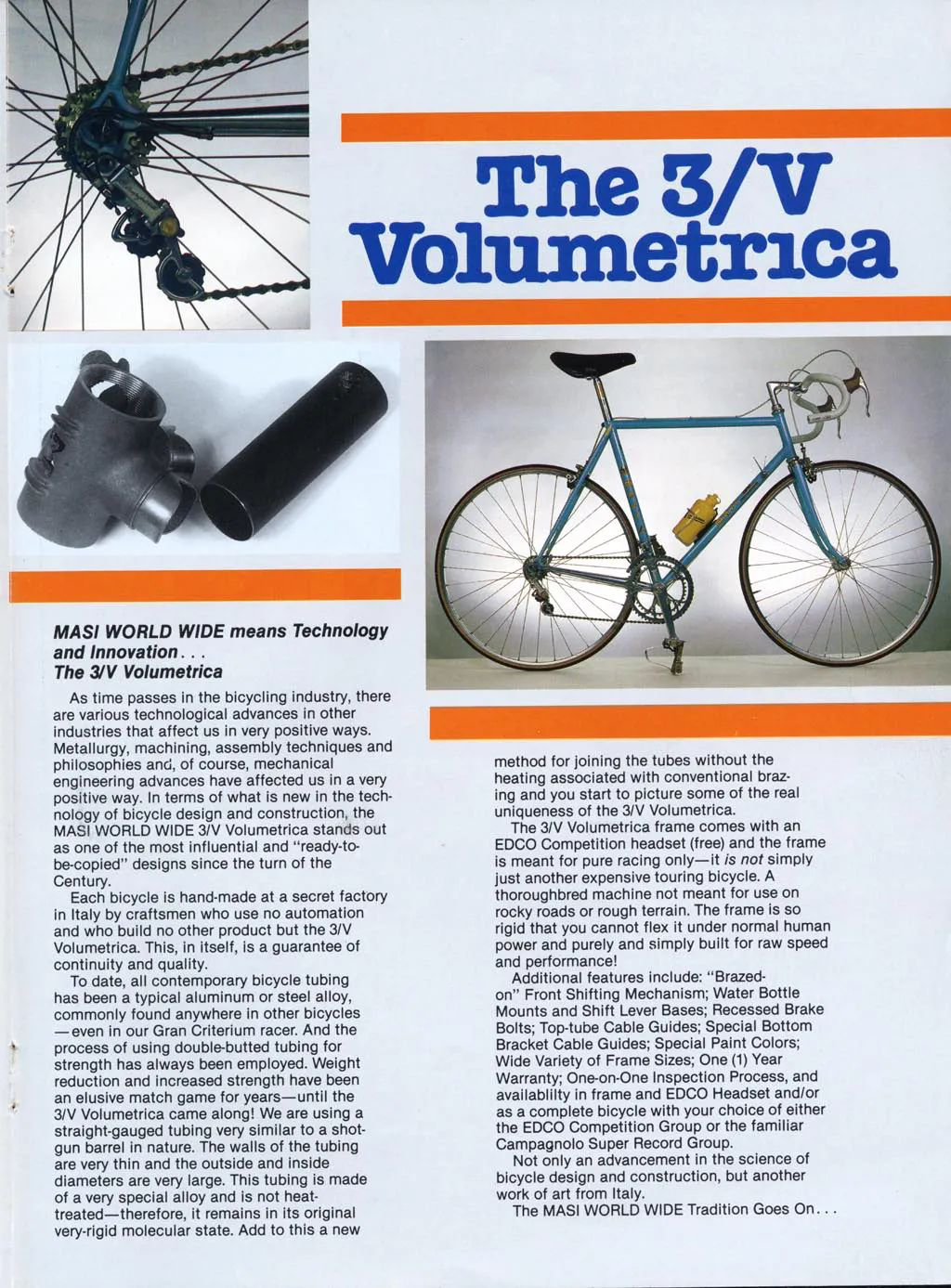 ▲从宣传图册中可以看到3V的五通LUG的内套管造型并不是普通的圆柱形,而是具有波浪开口造型,一来便于加工插入,二是可以减轻部分重量。诞生初期的3V搭配套管造型钢前叉,更是装配了campagnolo 50周年纪念版套件。摘选几句文字描述:由意大利秘密工厂专职工匠打造;枪管般超粗管径特殊合金非热成型管材;刚性极强只适用于竞赛;来自意大利的艺术结晶......