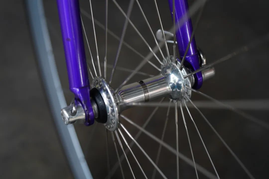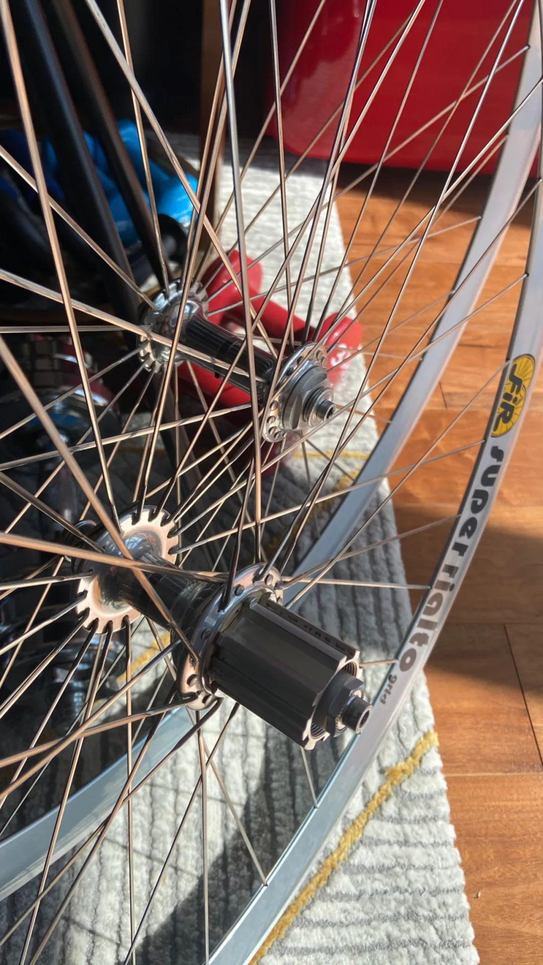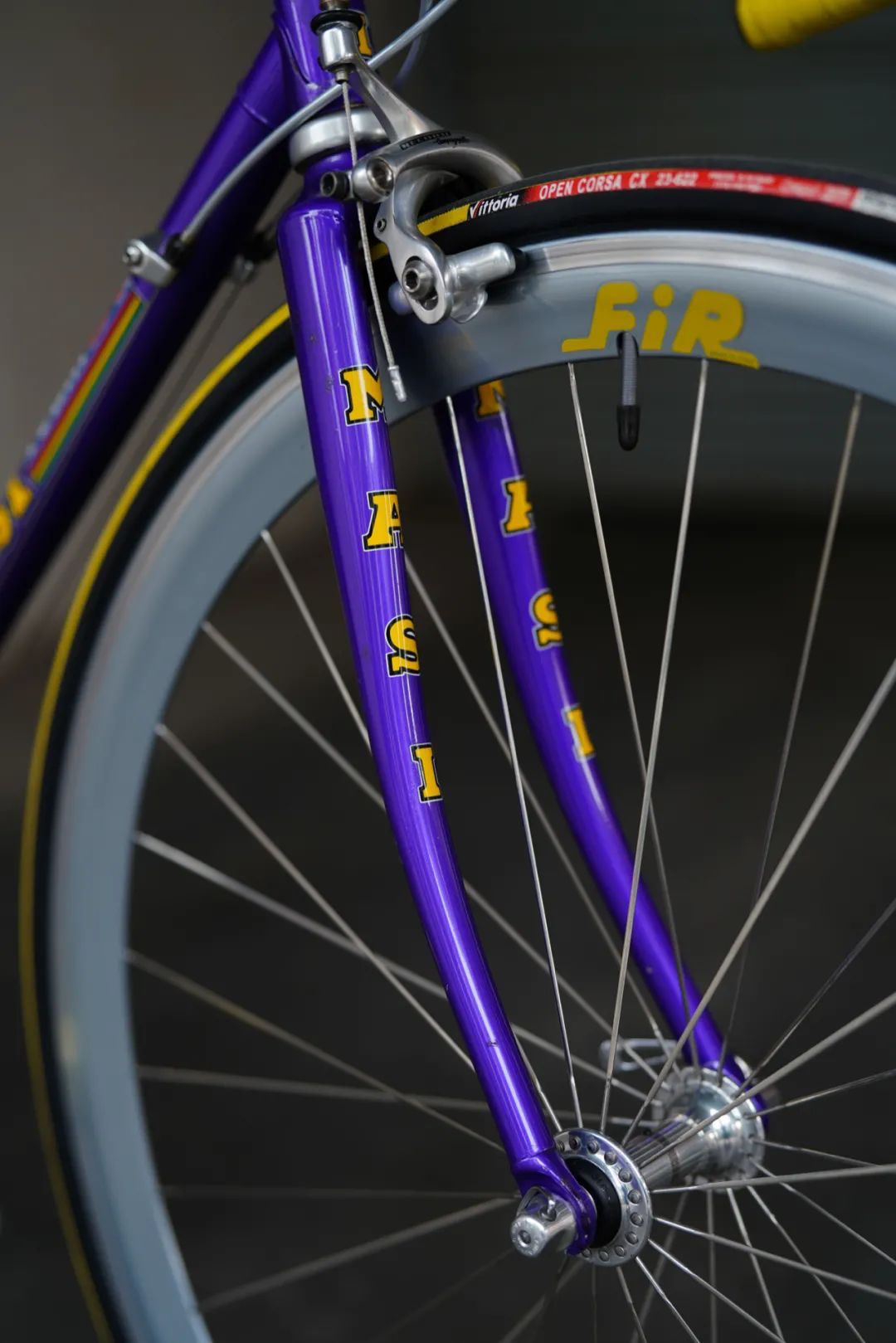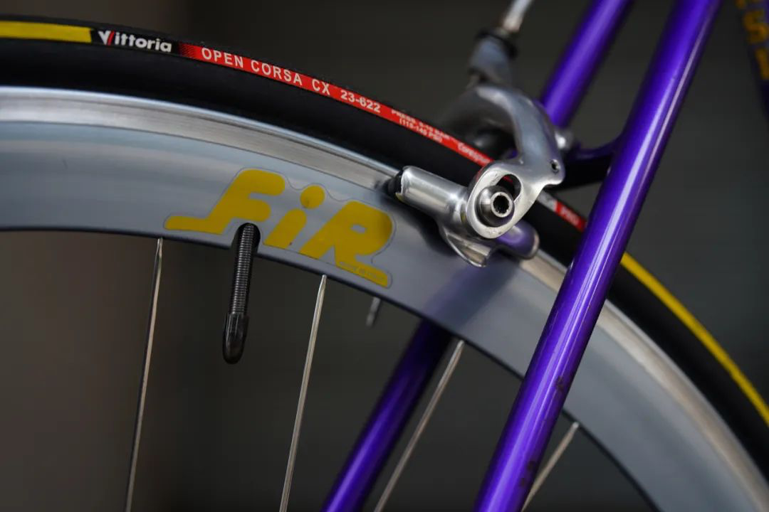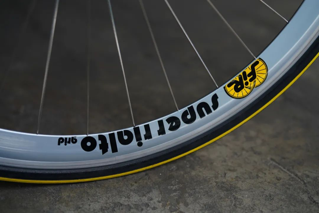 ▲轮组在车圈上选择了1999款Campagnolo Record titanium花鼓和意大利Fir 40mm三层刀圈super rialto,中文翻译过来是“超级高”,这种为追求空气动力而牺牲轻量化的“超高”刀圈流行于上世纪80-90年代。为了弥补车圈在重量上的损失,也为了气动造型,熊花选择了奢侈的Sapim cx-ray让我进行编制。