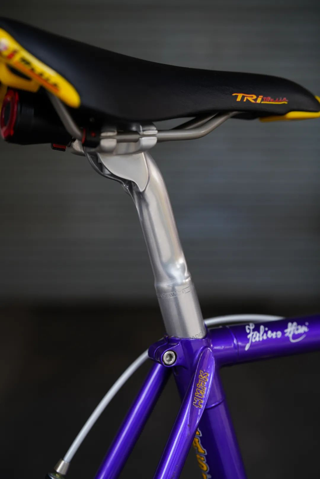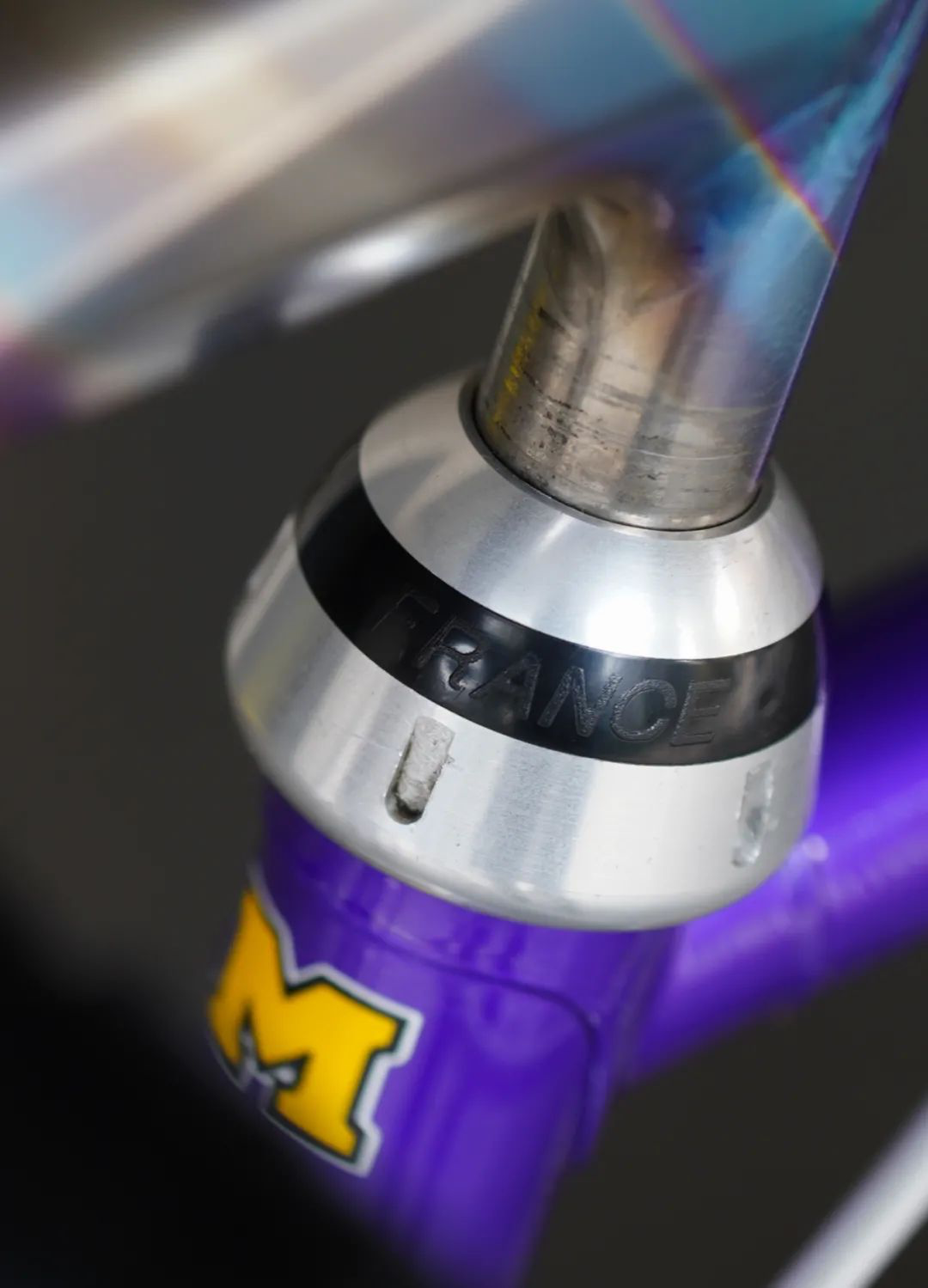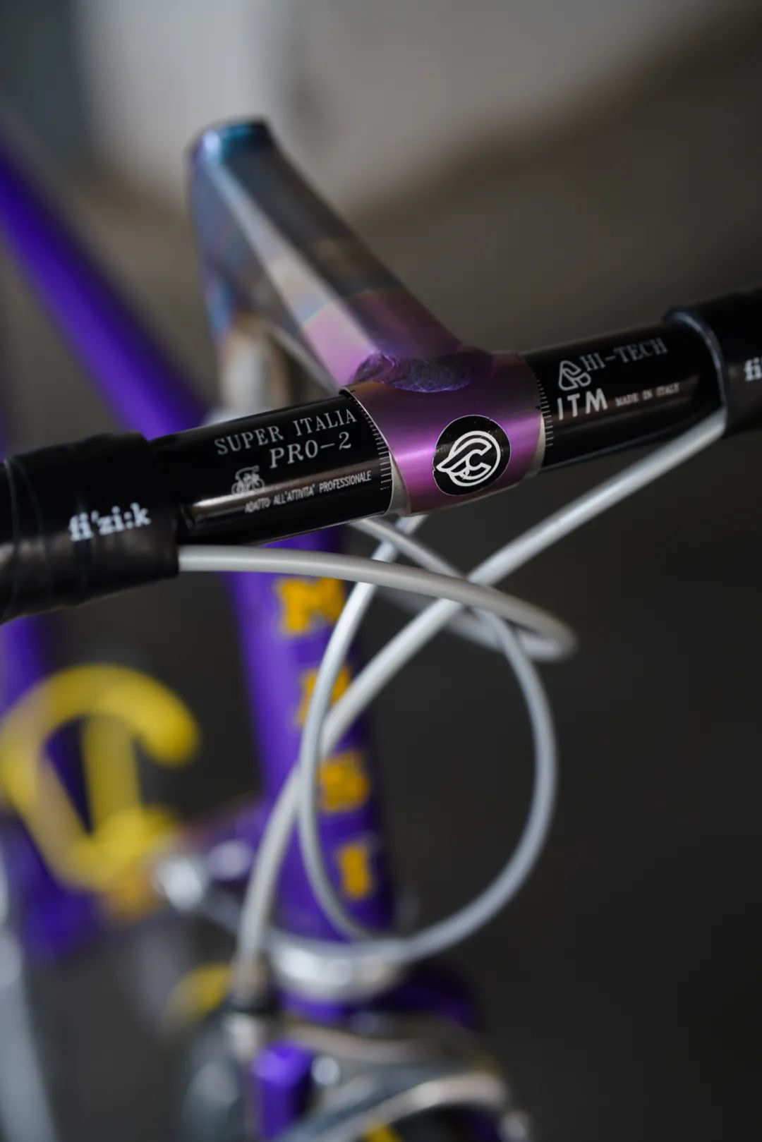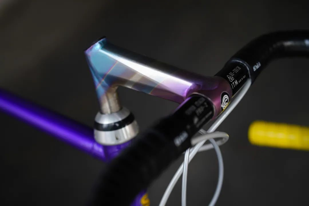 ▲Cinelli Grammo 鹅颈把立存量极少,钛合金可以在喷枪的炙烤下呈现出五彩斑斓的颜色,随着时间的延长,由金色、紫色向蓝色过渡。