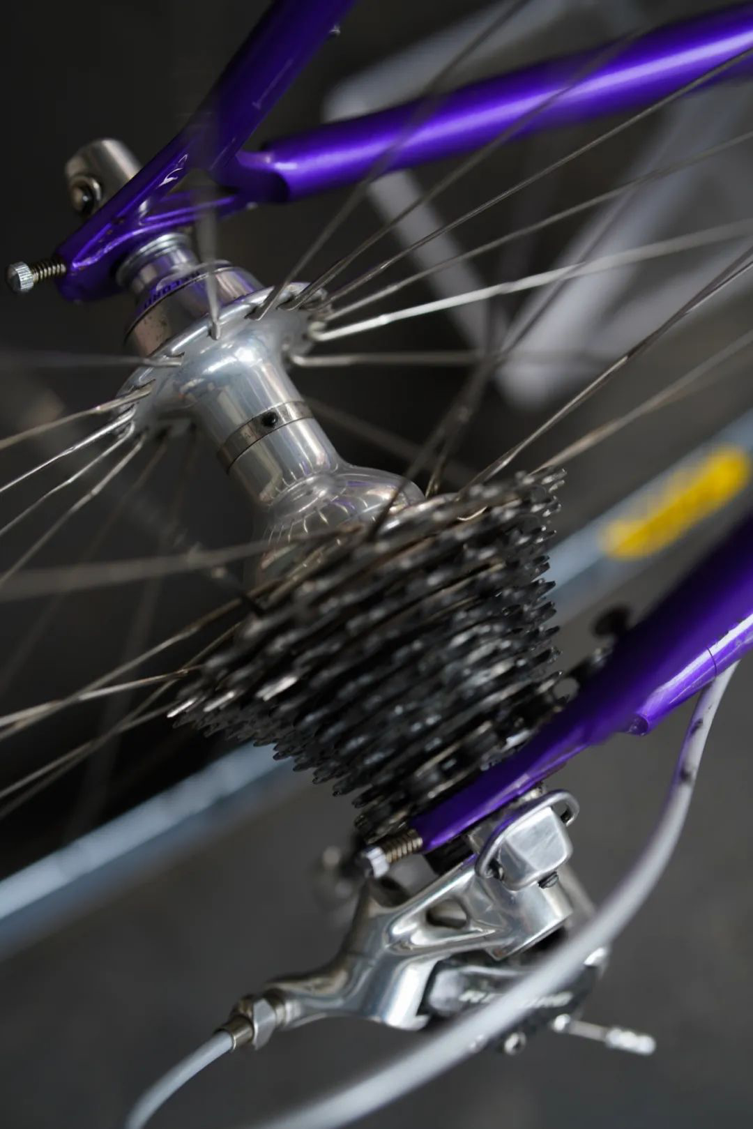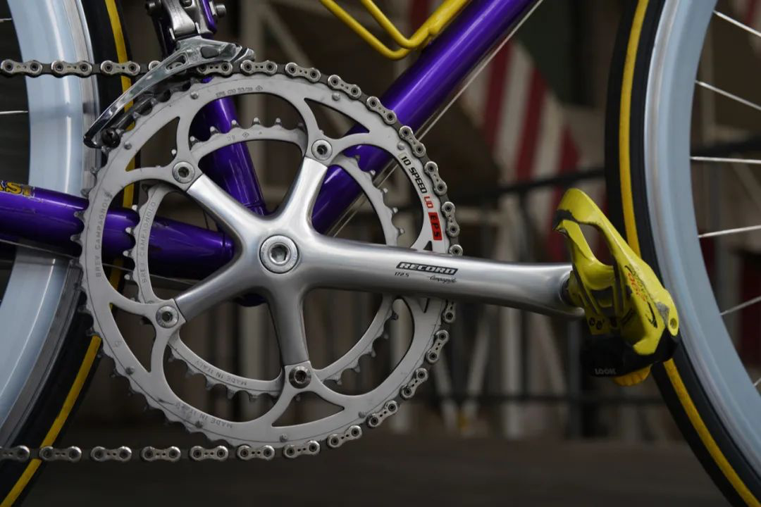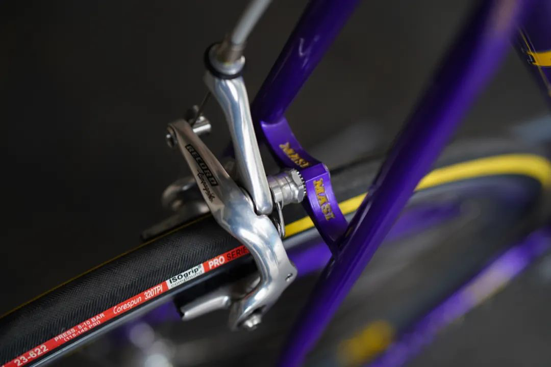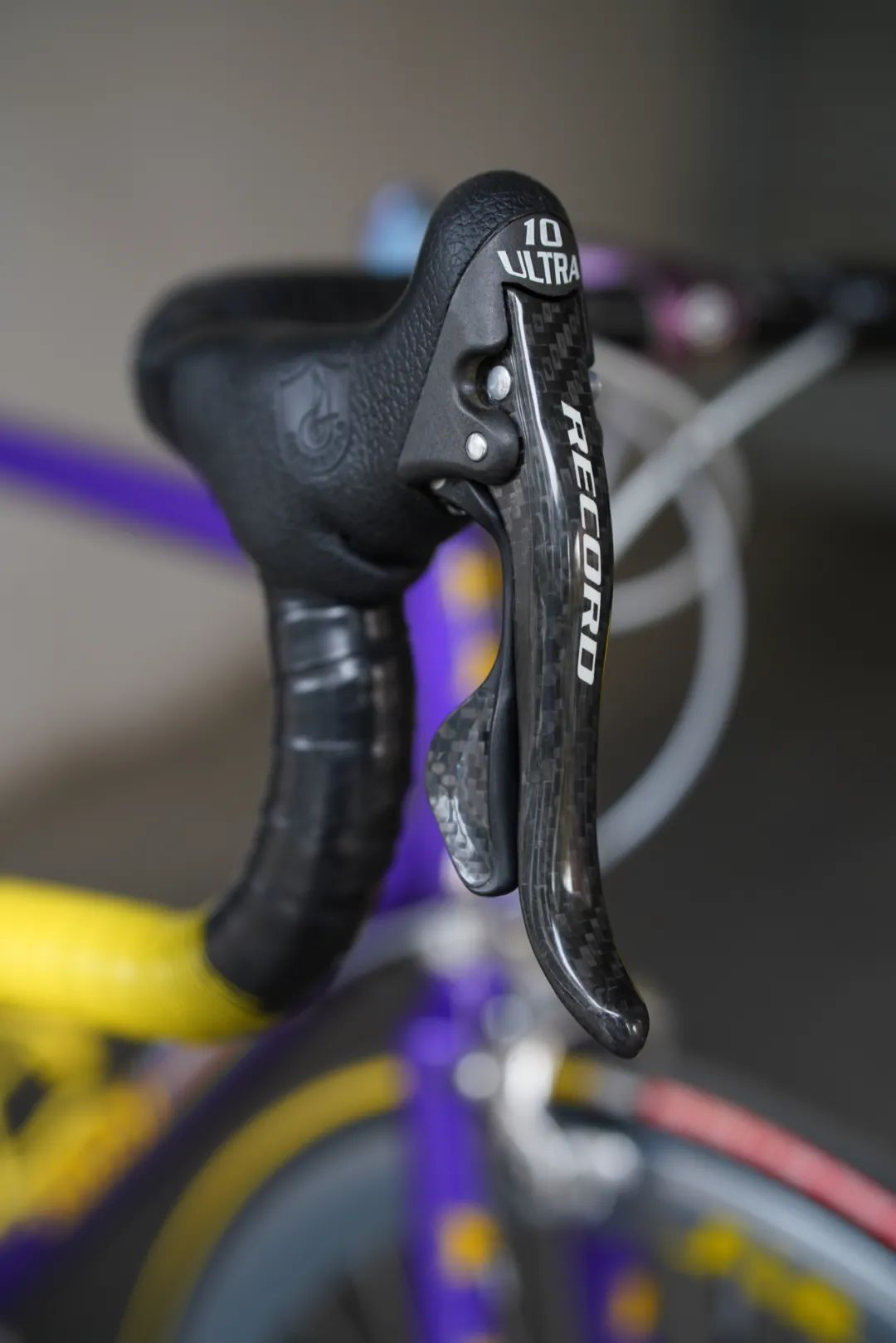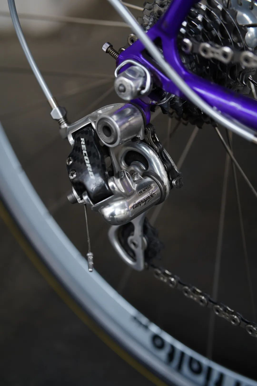 ▲在套件方面,熊花为MASI 3V搭配了一套几乎全新的2000年款Campagnolo Record Titanium,这套20年前的10速变速套件即使放在今天,无论是重量还是性能都毫不含糊,变速刹车手感极佳。