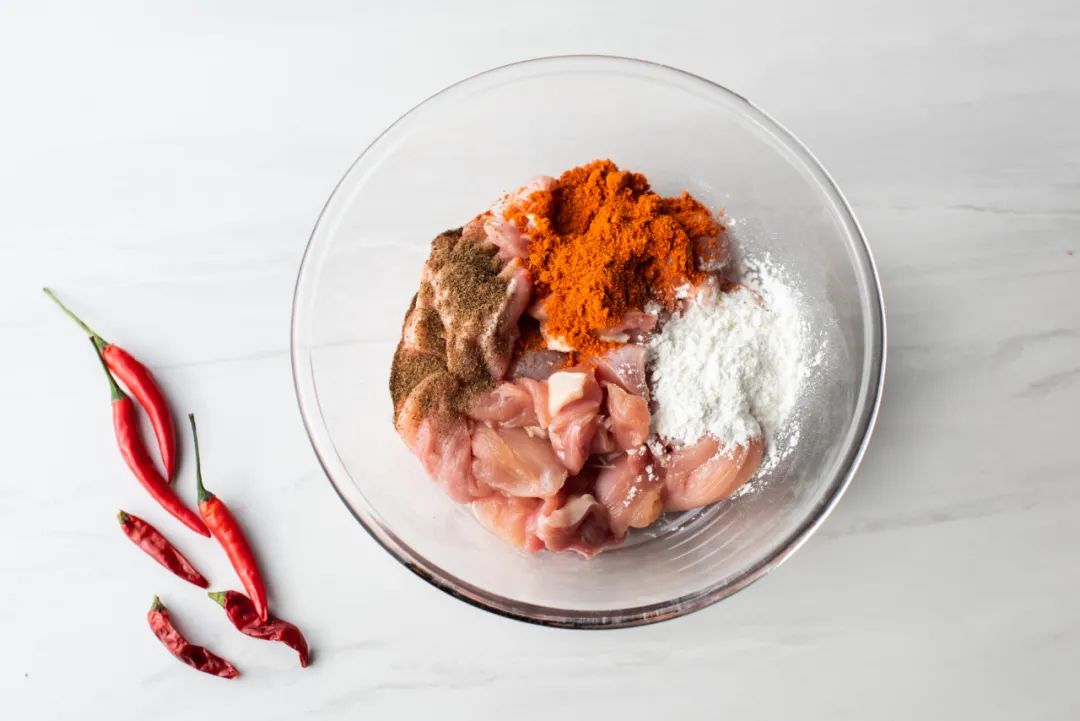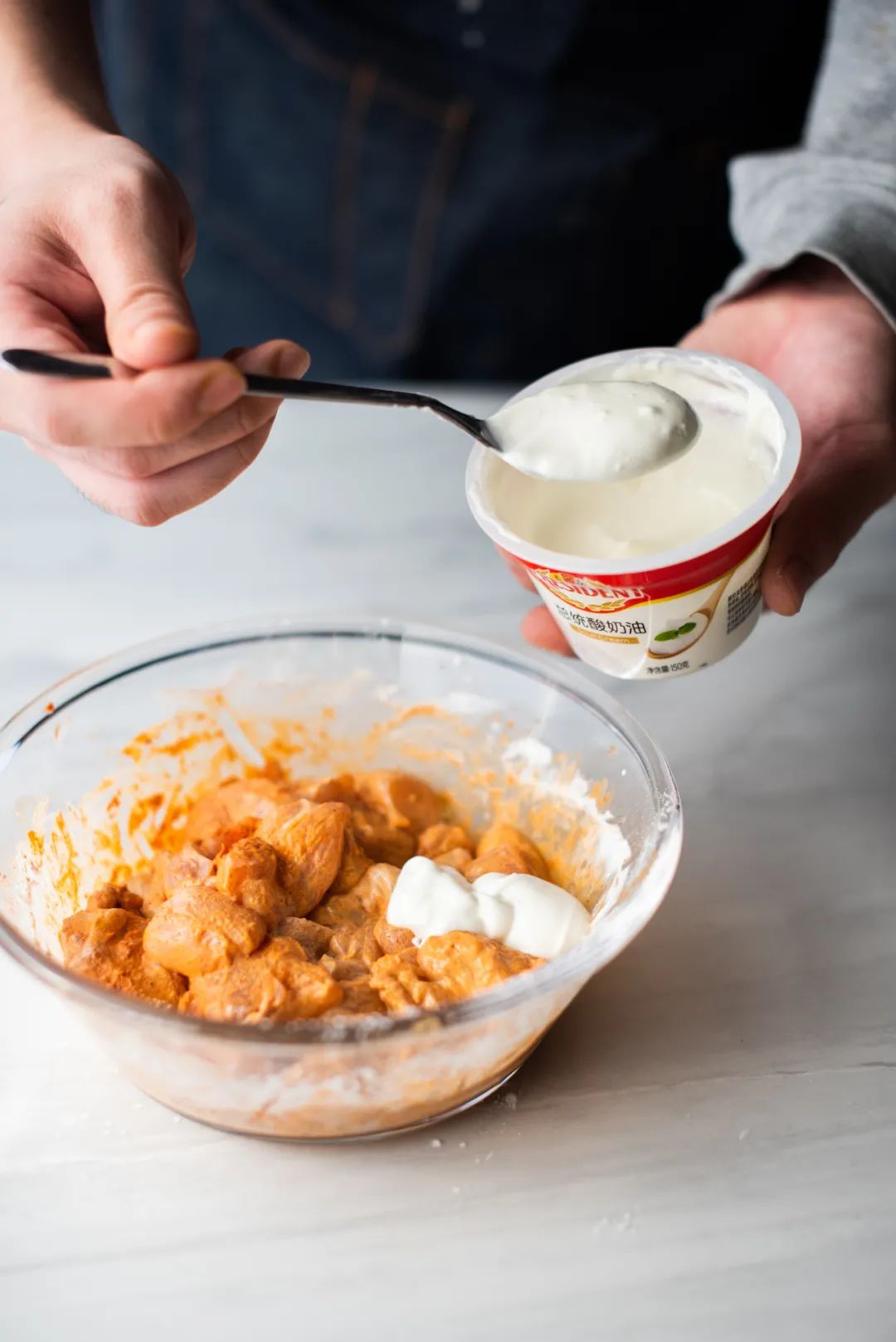 500g鸡腿肉切块,加入20g辣椒粉、10g印度综合香粉、5g玉米淀粉与80g酸奶油。