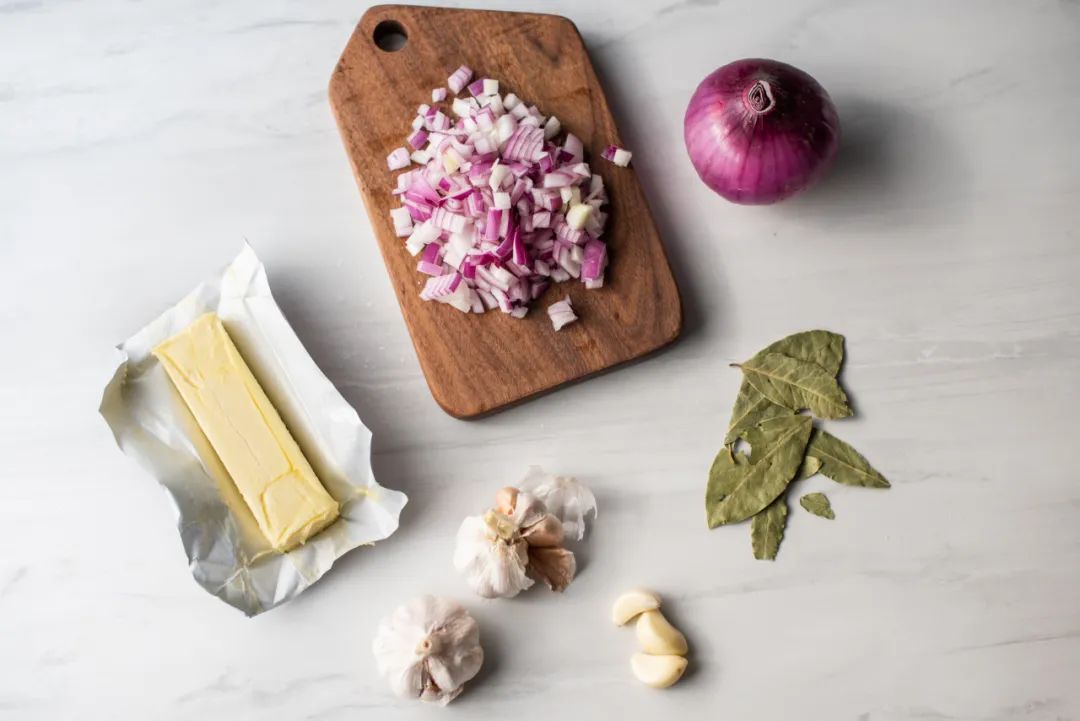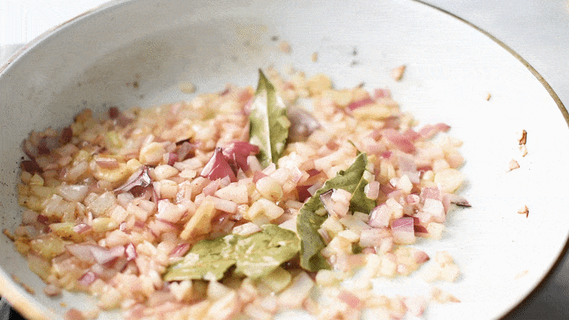 再加蒜蓉姜末和几片香叶,小火慢慢煸炒。
