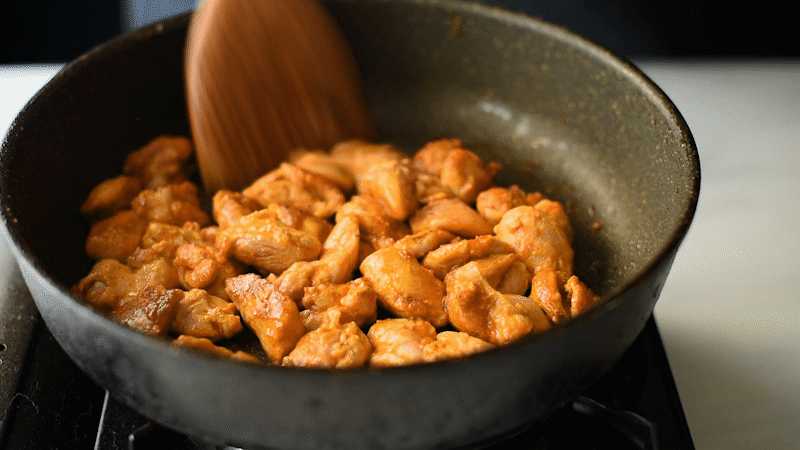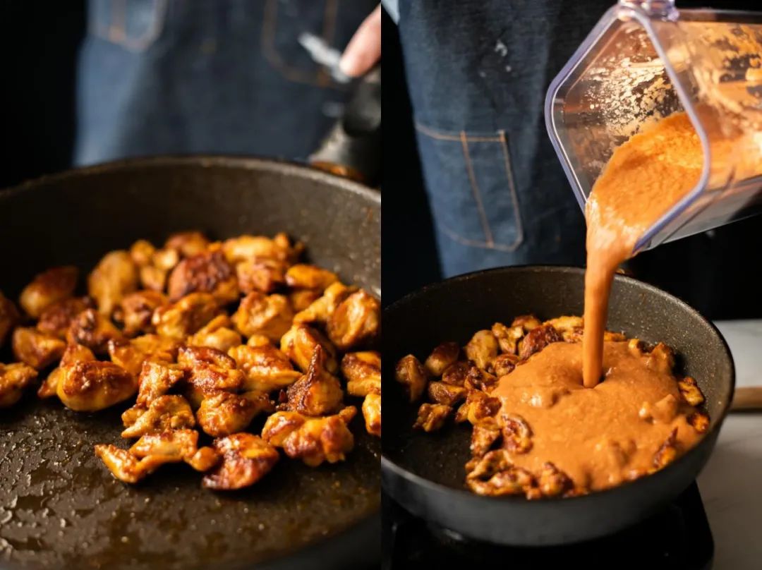 用香料奶油腌制的鸡肉,下锅煸炒。