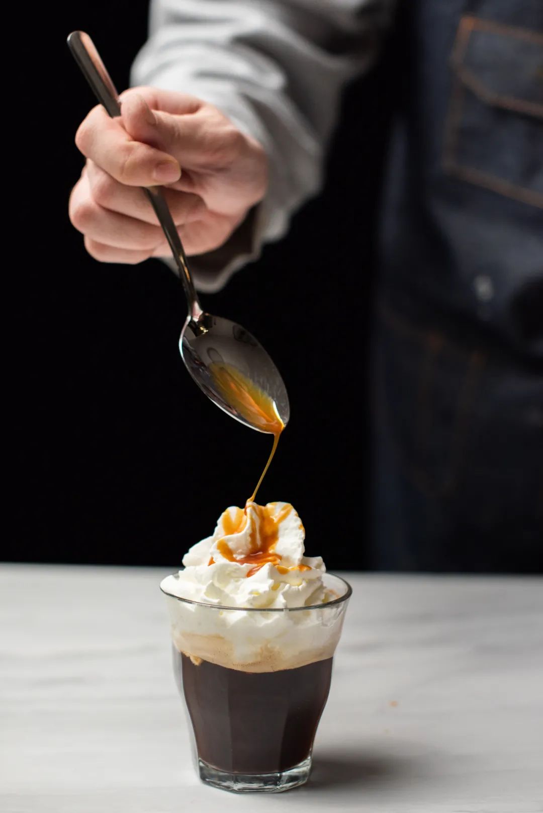 暖暖的咖啡加一点威士忌,可以快速驱走身体的寒意。 喝着喝着,从层次分明到你中有我,清甜奶香、浓烈酒香、焦苦咖啡香在一杯中交融,实在太适合冬天的沙发时间了。