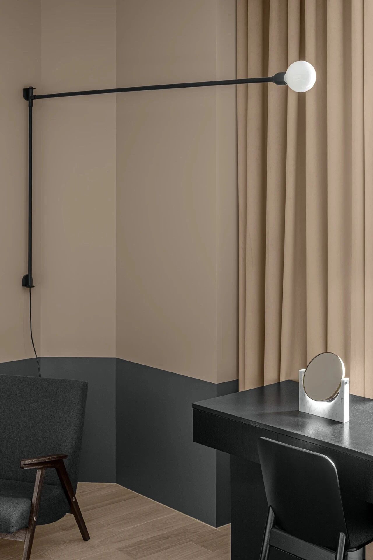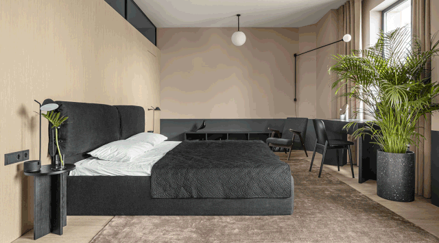 卧室米黄色的护墙板、布艺窗帘占据了整个墙面与地板颜色十分相近再搭配黑色的床、床头柜、灯具等减少了色彩上的繁琐感,让整个空间显得更加和谐。