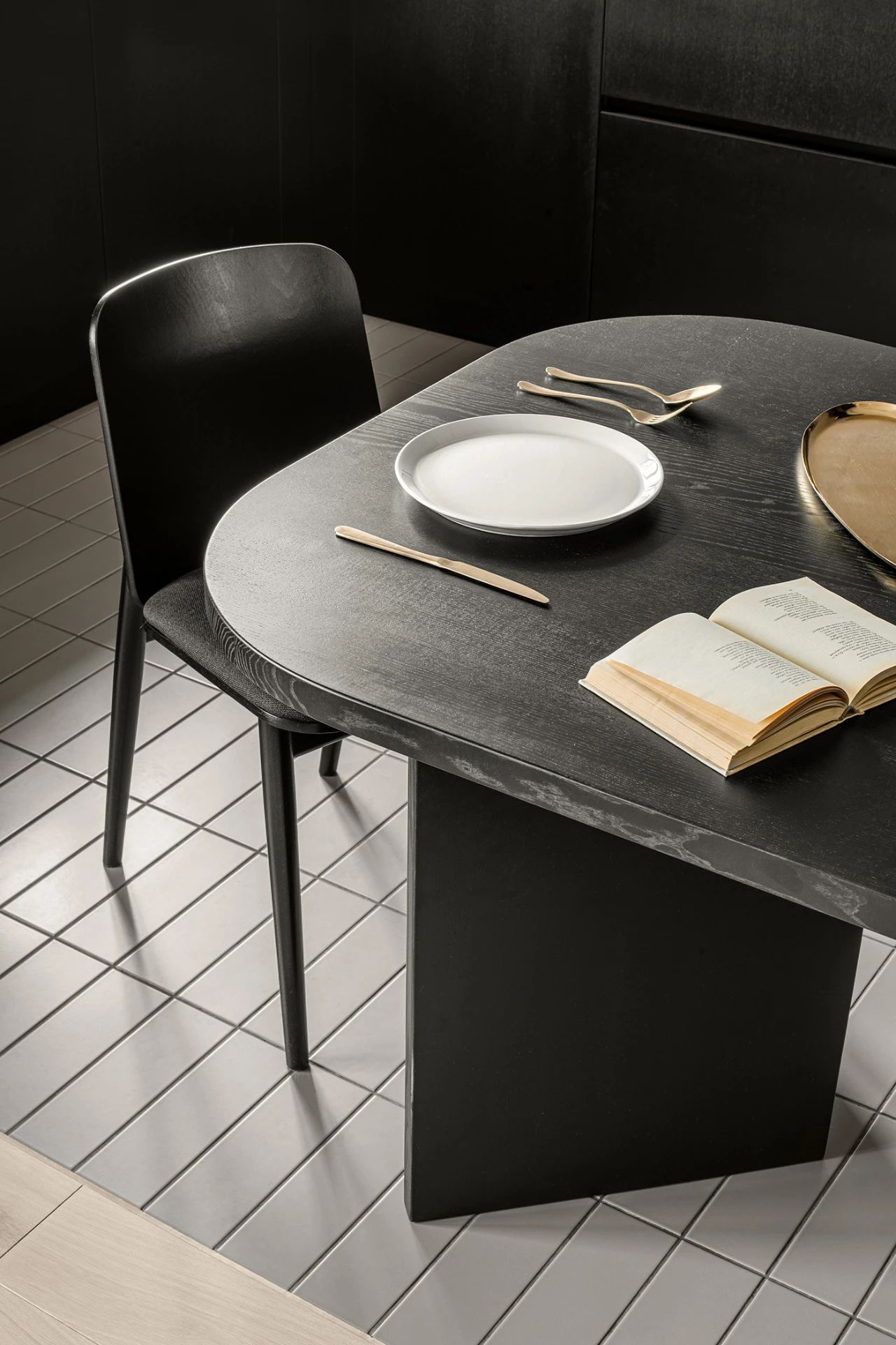 造型简单的餐桌椅位于空间的中央区域也是厨房也客厅的区分,黑色的桌面将白色的瓷盘衬托的更鲜明。