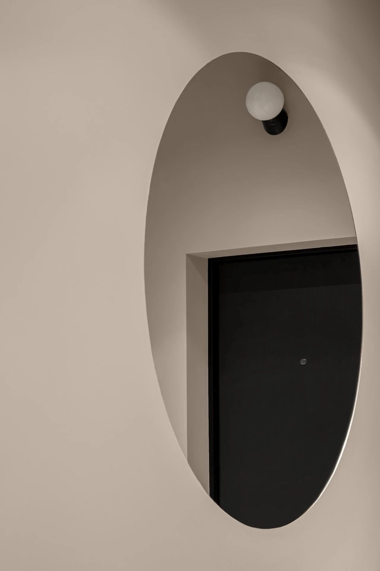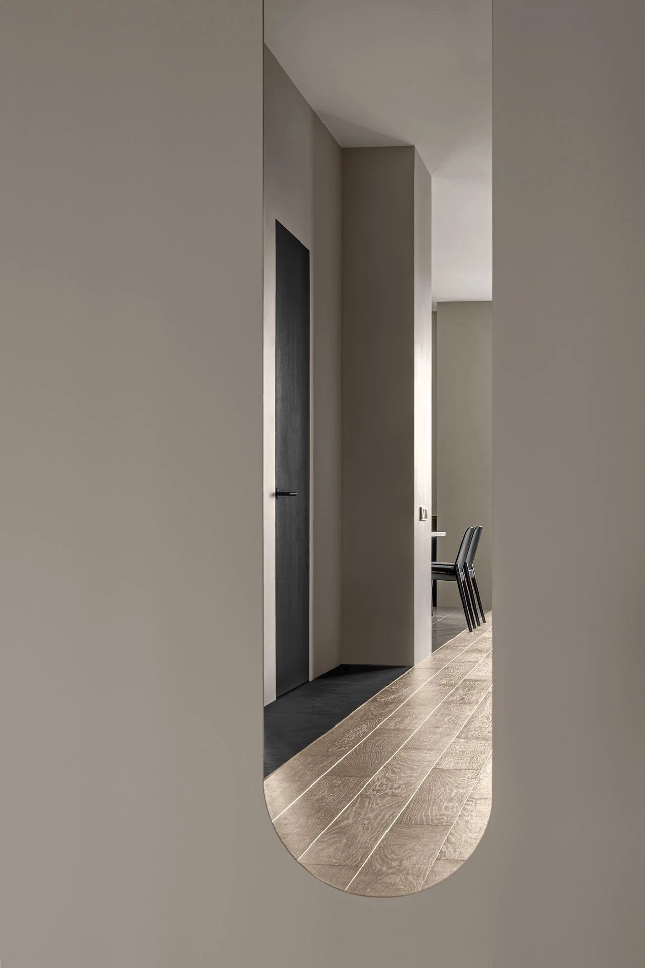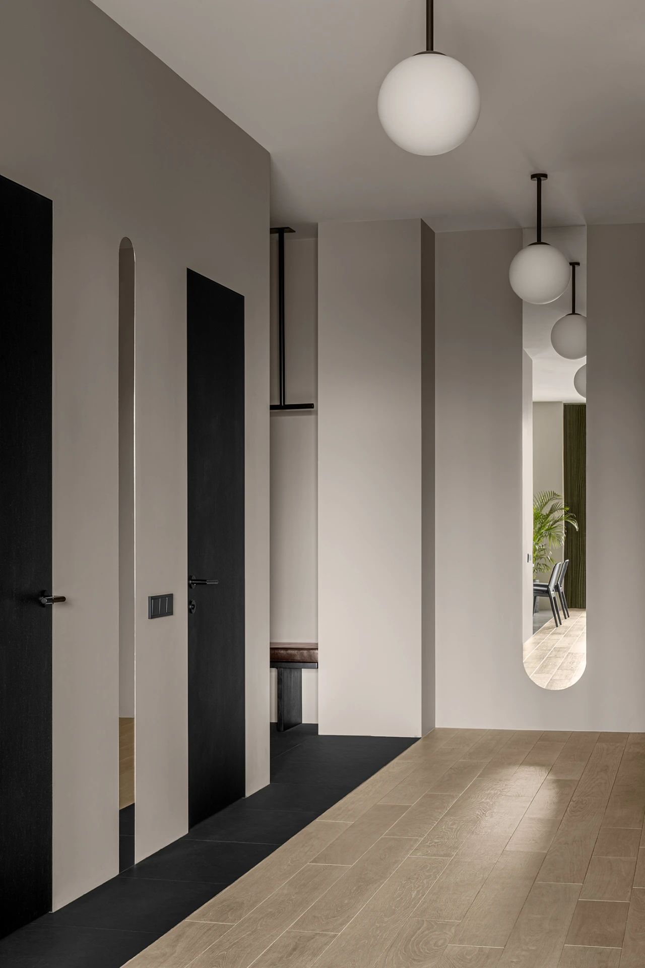通往起居室的过道,设计师在三处位置运用了镜面设计,原本沉闷的走廊在镜面的装饰下更加灵动,顶部的球形灯在尽头的镜面中得到连续增加了视觉延伸感。