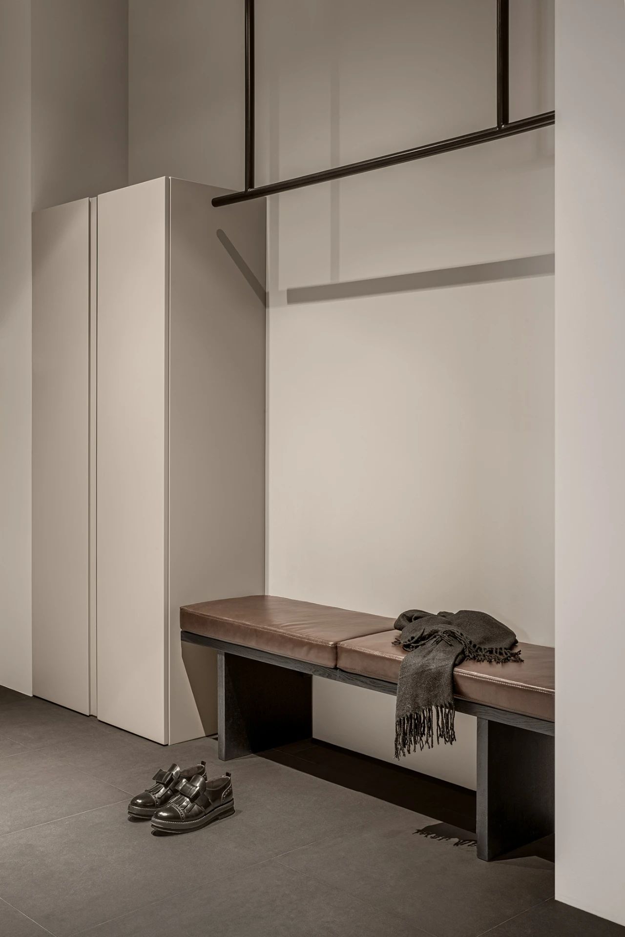 室内玄关的设计简约清新没有复杂的装饰,长条形换鞋凳,顶部的挂杆设计虽简单但十分贴心。