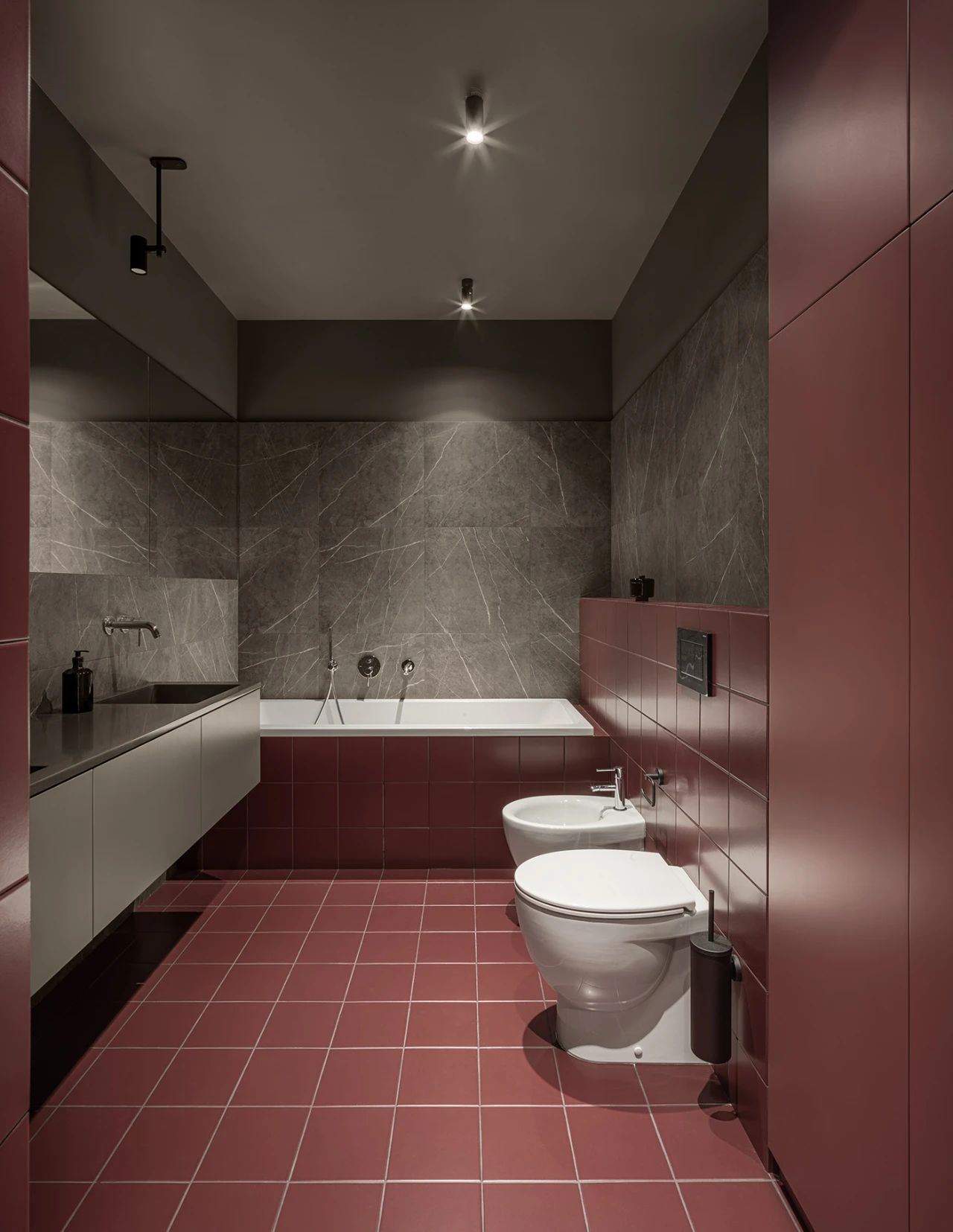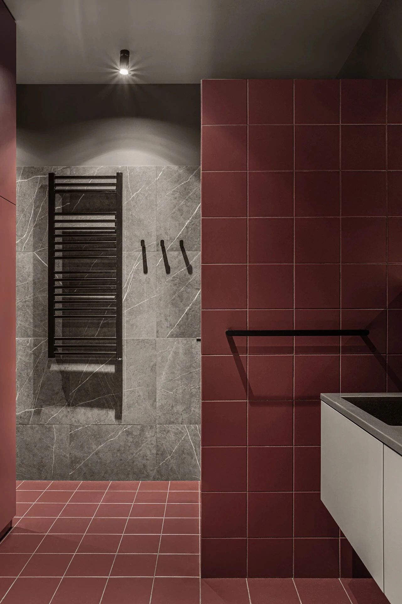 主卫选用深红色与灰色相拼使热情与沉静并存,在顶部灯光的照耀下又多了一丝精致感,灰白色洗漱台哑光的材质柜体极致简约。