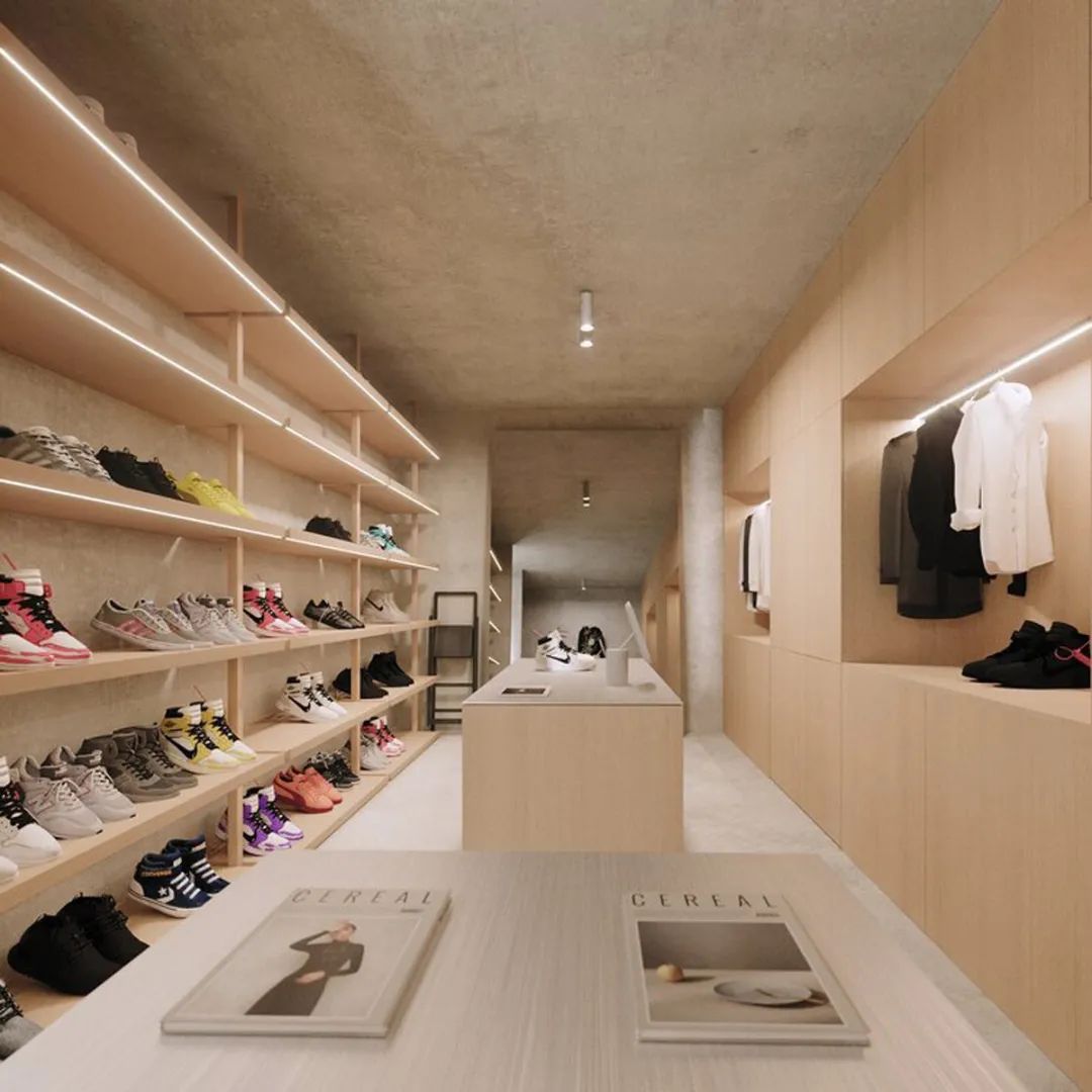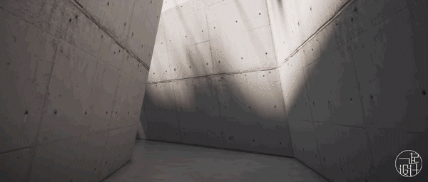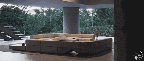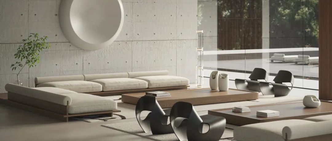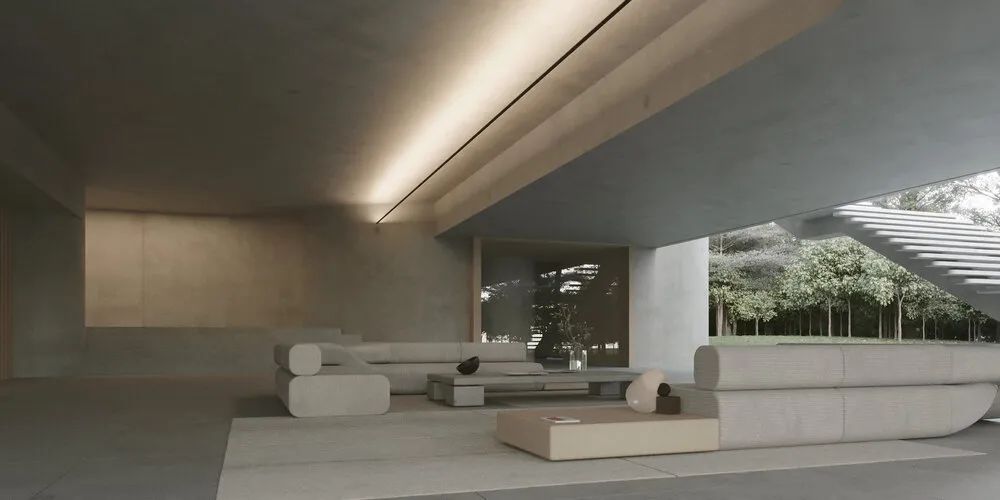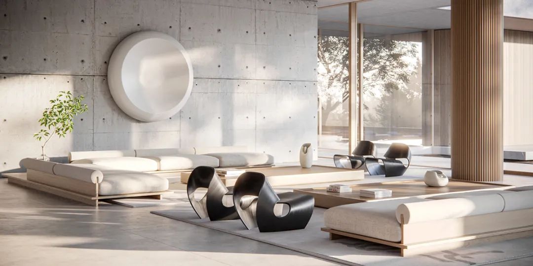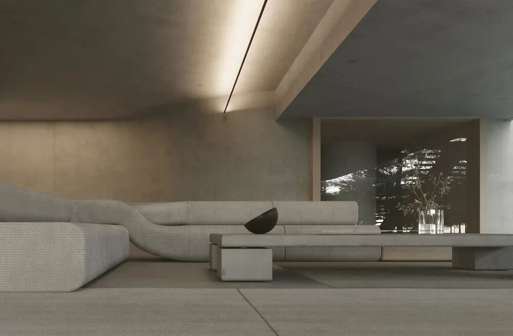 混凝土墙面以及天花板构造出开阔的尺度,两个 L 型沙发对立而设,简约之中包含着满满的设计感。