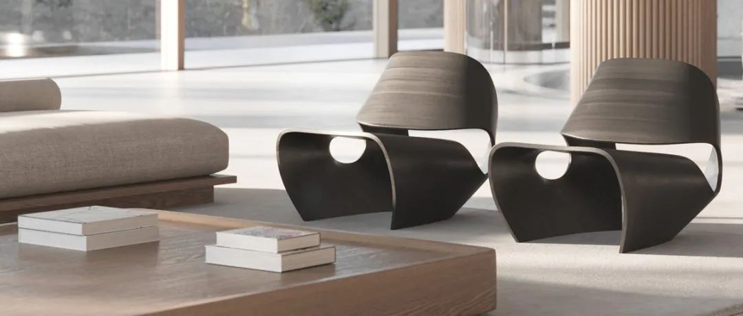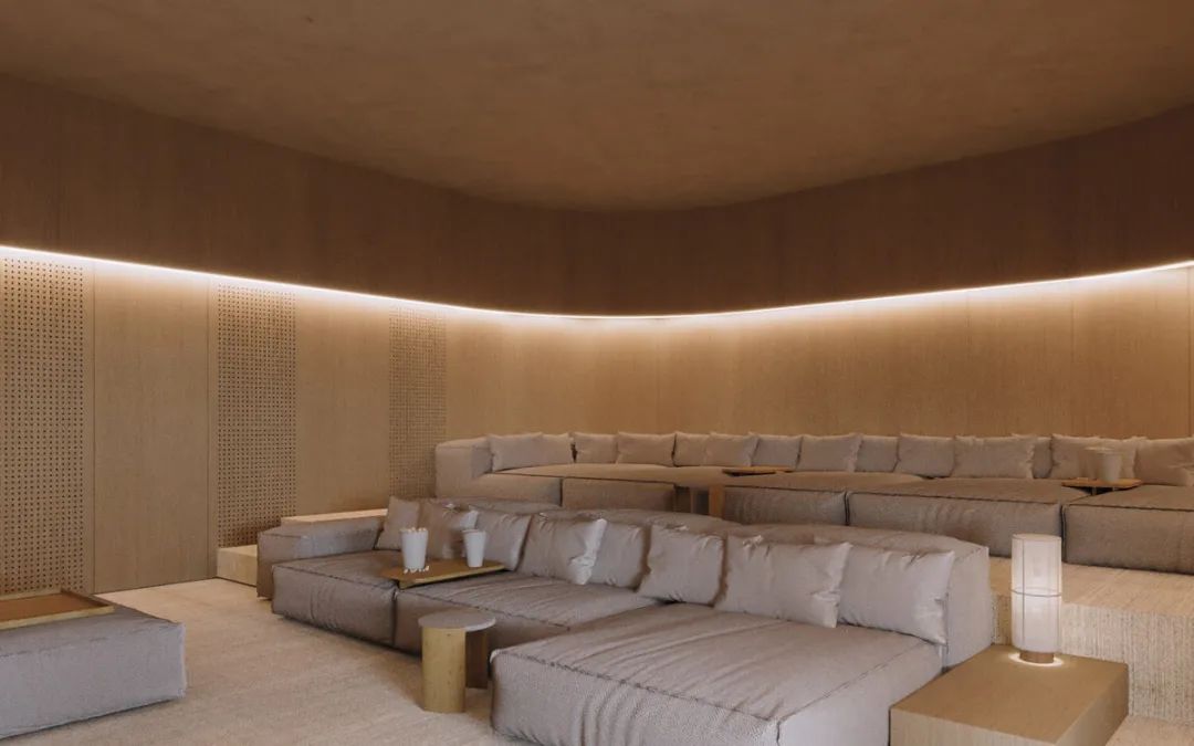 既然是豪宅,那么休闲空间当然一个都少不了,深色的木材墙面在视觉上形成过渡,圆形孔洞投射下来的波光也让人倍感放松。