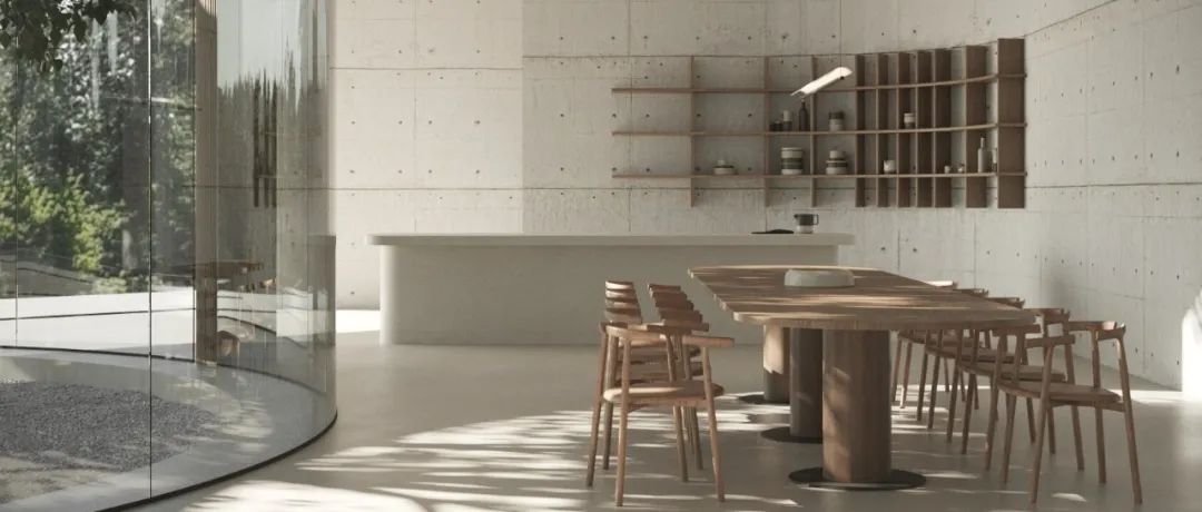 开放式的布局中还包含了餐桌和厨房,木制的长桌以及扶手椅与混凝土墙面形成对比,又融合的恰到好处。