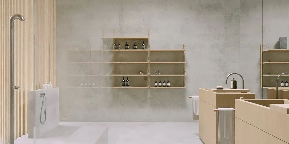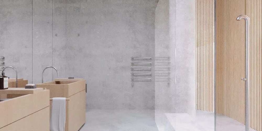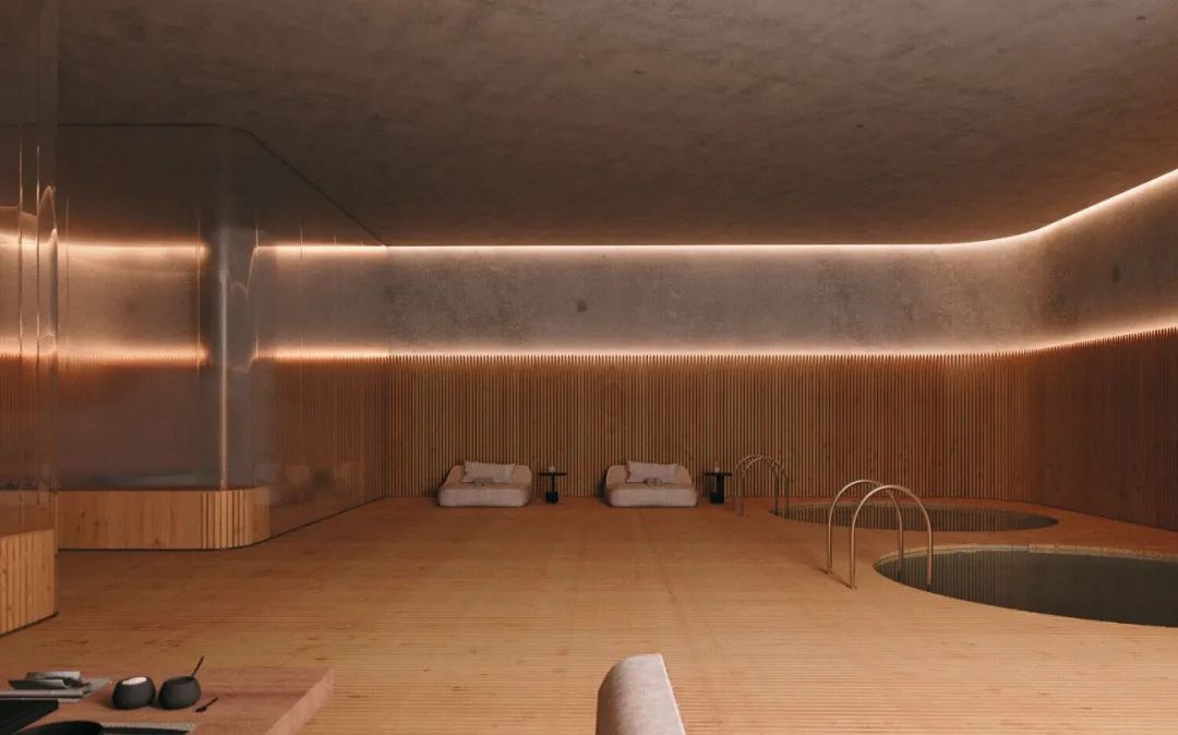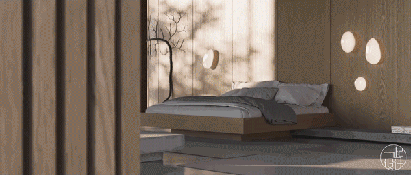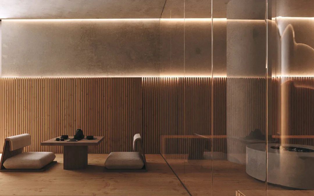 墙面被一分为二,又是混凝土与木材的组合,两条灯条包裹着整个空间,营造出宁静的氛围。
