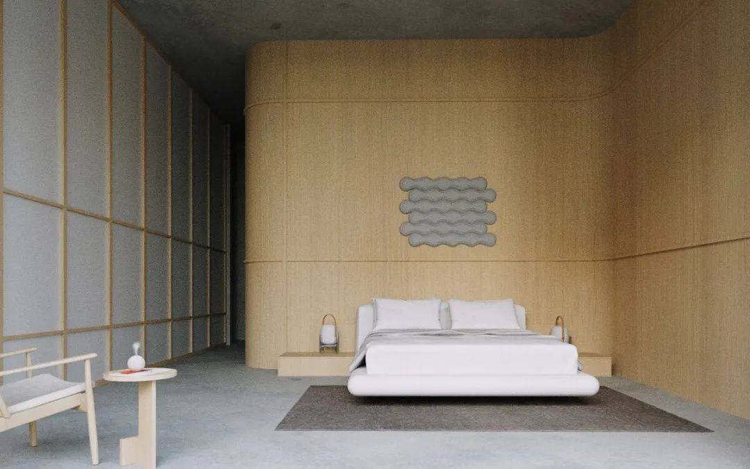 低矮的床铺配合高高的木制背景墙,再加上圆滑的弧度,提供了舒适的休息场所。
