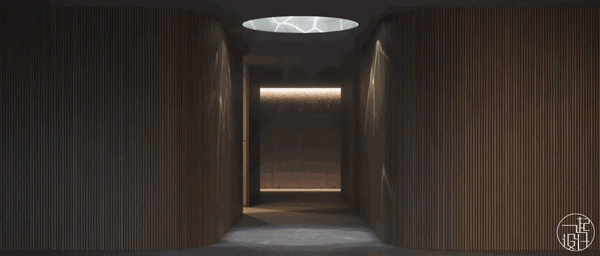带有弧度的天花板正好容纳下一个线性的照明,光线打到天花板上再漫射开来,营造出柔和的氛围感。
