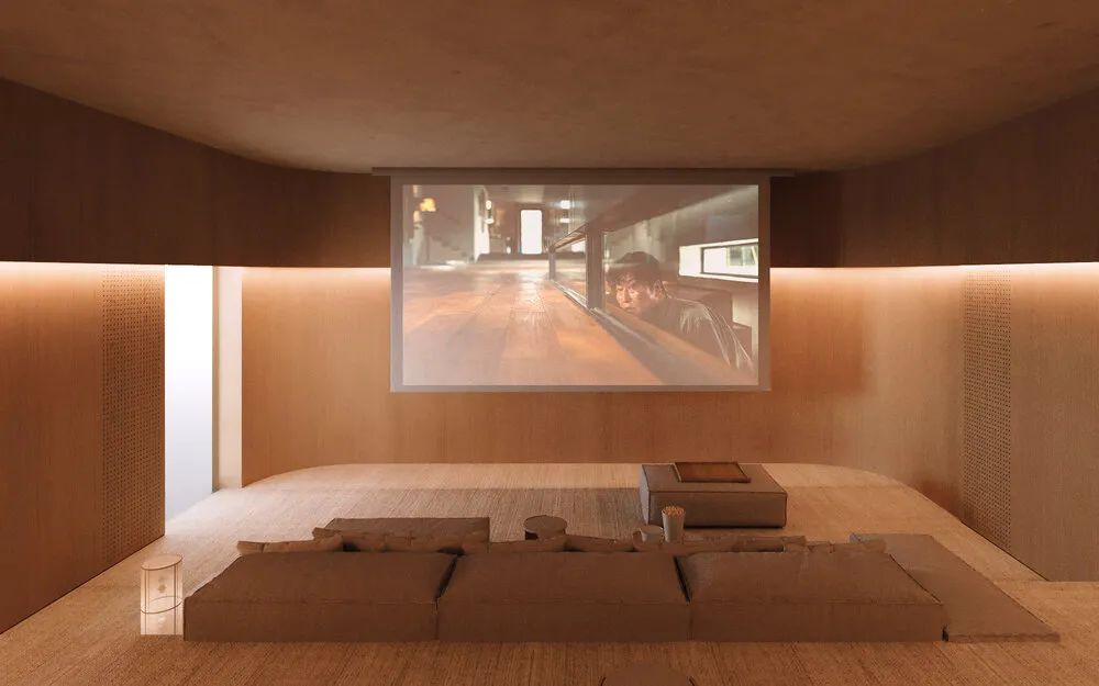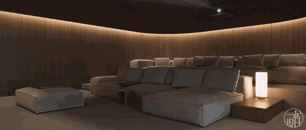 私人影院内配备了舒适的布艺沙发,一旁的台灯也颇具日式风味。