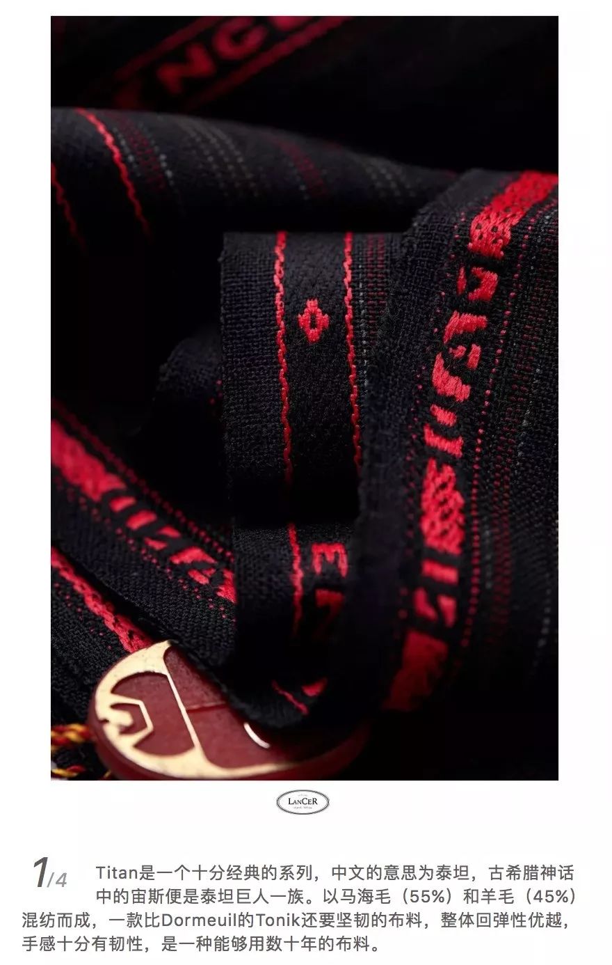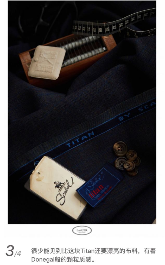 Tonik之于Dormeuil,就如Titan之于Scabal一样,Titan同样是以马海毛为原料的一种三股纱支面料,质感更加粗犷,是Tonik大热的时候,Scabal推出的和Dormeuil竞争的马海毛系列。很多爱好者都不知道,今天Titan相对Tonik来说数量更稀少一些,甚至不止一些。原因是当时Titan的销量其实要比Tonik更好,能留在市面上的Titan可以说是大海捞针。Titan意指古希腊神话中世界的主宰者,这也表明了Scabal的野心。在Titan之后的几十年里,Scabal在面料领域研发一路领先,不仅首次突破100支,相继而来的180支,200支也是Scabal研发的成果。