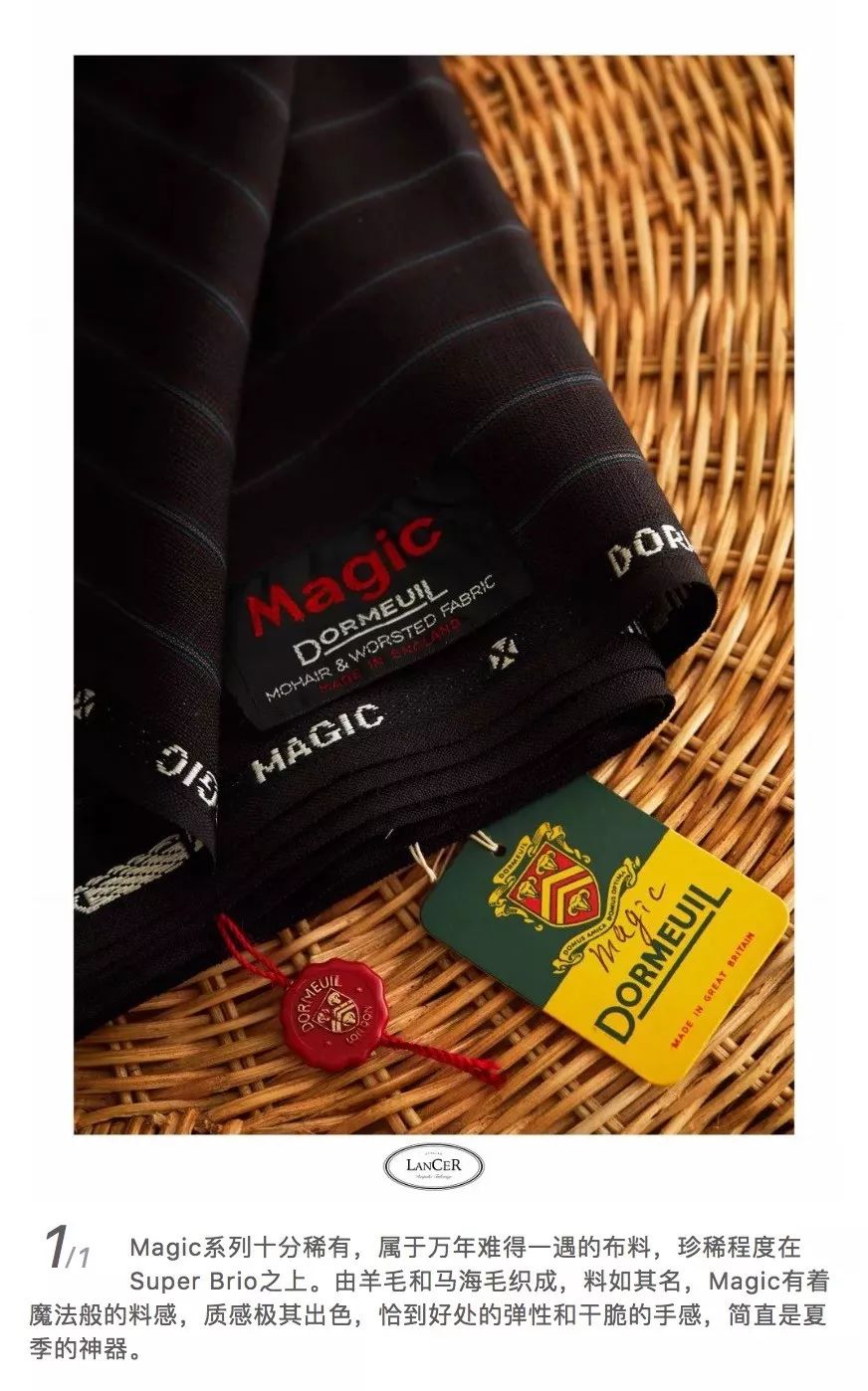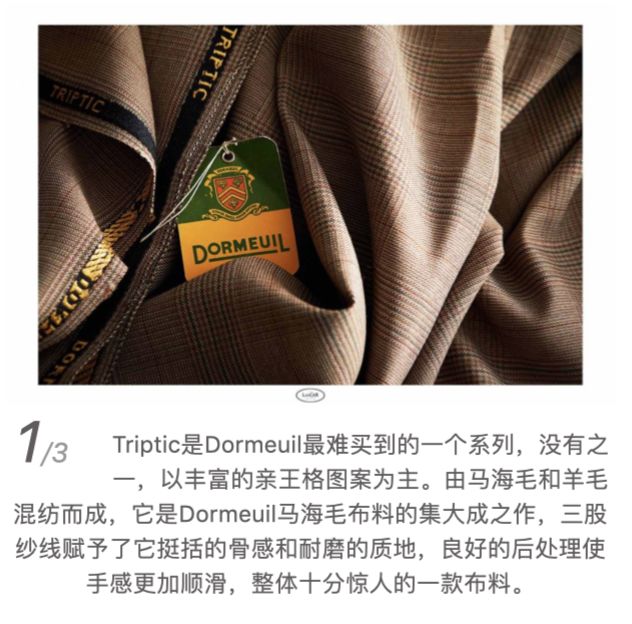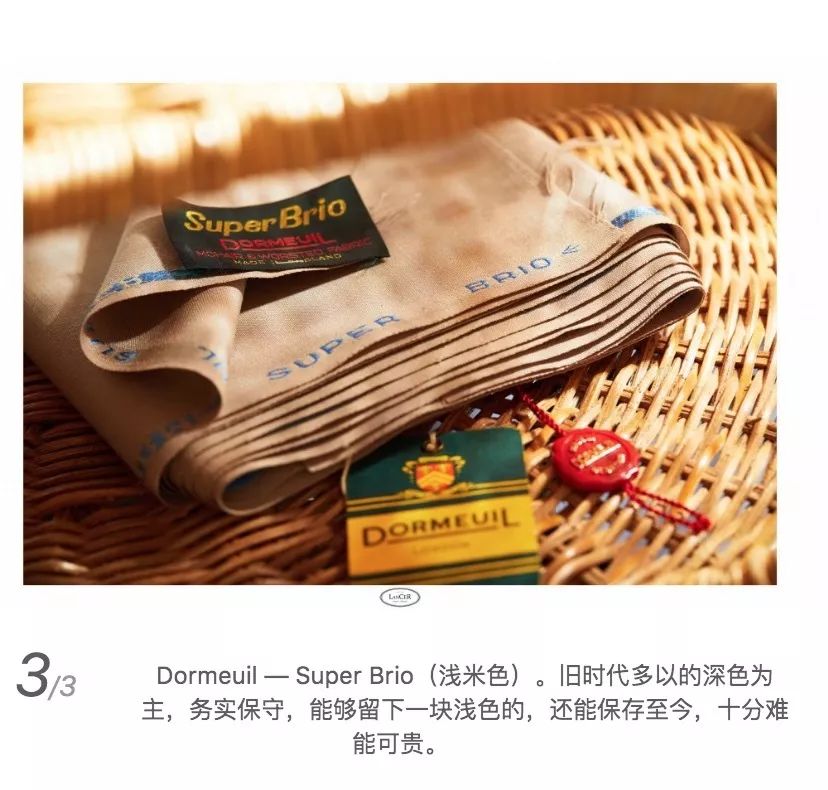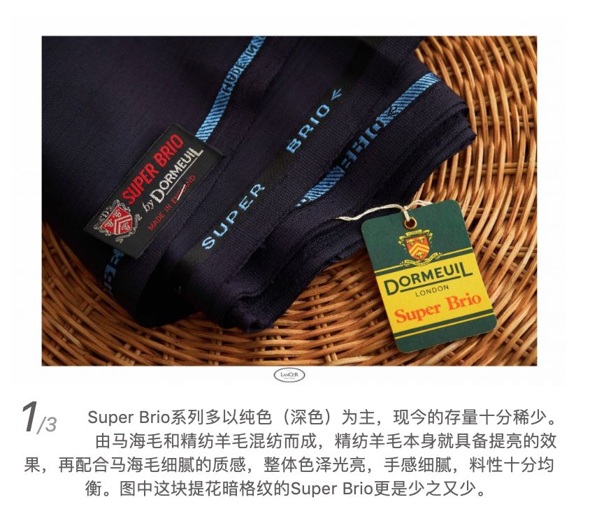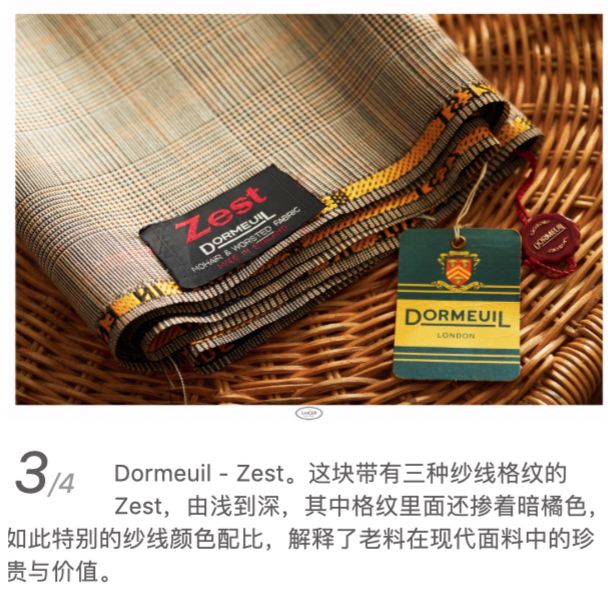 老Dormeuil的马海毛五虎是最令人沉醉并向往的。除了老大Tonik,老二Magic、老三Zest、老四Triptic、老五Kidor和70年代精致登场的Super Brio,都比Tonik有过之而无不及。比如Super Brio就非常珍稀,属当期能找到的最好的马海毛,混入高支纱羊毛,极难入手,其手感和光泽度与现在市场上的面料比也是绰绰有余,唯独通常都是纯色;而老三Zest则料性稳定,广受好评,大多是条纹;老四Triptic则是稀有中的稀有,有着丰富的亲王格图案。老Dormeuil的马海毛系列,尤如莱卡35mm镜头里的八枚玉、六枚玉和七枚玉,美不胜收,各有千秋。
