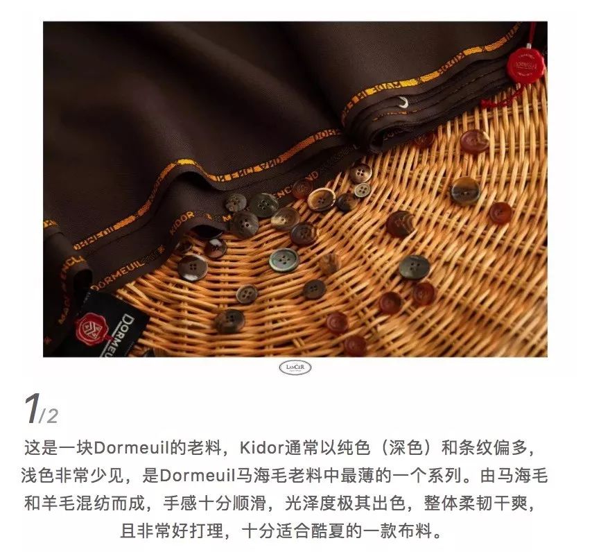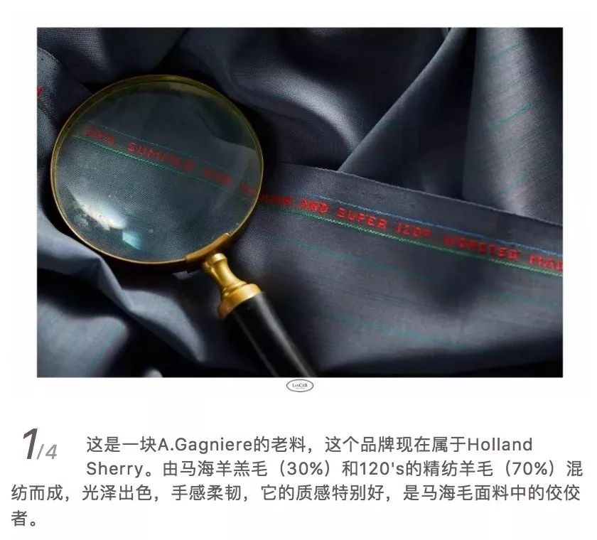 英国面料的黄金时代在上世纪中旬,那时意大利的飓风尚未吹起,Biella的面料根本不入玩家法眼。英国人好像对于处理马海毛有种得心应手的天赋。然而在2014年, Vitale Barberis Canonico(VBC)以一千克632兰特的价格在南非收购了一批24毫米的幼年马海毛原料,这是有史以来的最高价格。要知道好的原材料对纺织一块面料有多么重要的影响,而这批幼年马海毛原料分别供给了Drapers、Loro Piana和Smith Woollens织布,系列分别为Mohair、Karoos 24 Kids及Super Kid Mohair,其中Loro Piana有260克的选择,垂感突出,回弹性卓越。