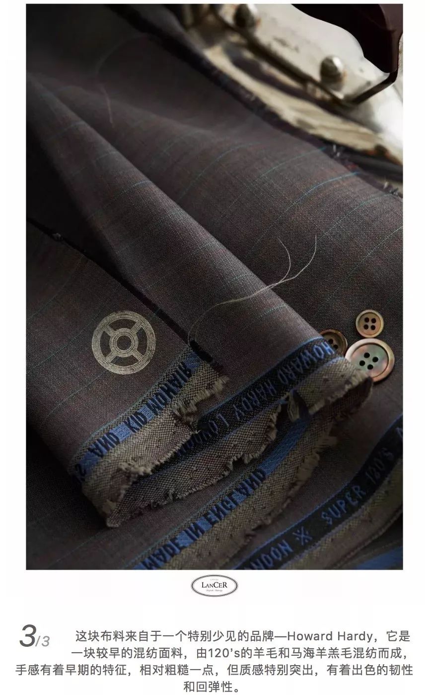 说完大裁缝专用的料子,说说小裁缝首选的面料。有一个说法,Savile Row上刚刚出师的裁缝都会选用Bateman Ogden,其面料性能和价格优势都是大家选择的原因,加上在Savile Row上刚刚出师的裁缝要做一套毕业作品,师傅会要求他以Bateman Ogden做一套西服,因其料性安全,操控稳定。另一方面,笔者认为Bateman Ogden面料最大的卖点是其独有的复古感,包括其颜色、织法、手感和光泽是在别的现代面料中难以寻找。要形容为“入门裁缝的试金石,萨街面料的教科书”绝不为过。又以马海毛为例,淡淡的米色加入了提花条纹,更以双色经纬纱去编织,甚至在古董面料里也不一定能找到如此花色。俗语说千里马虽多,但伯乐少,喜欢 “老钱味”的玩家们必须要多加留意!