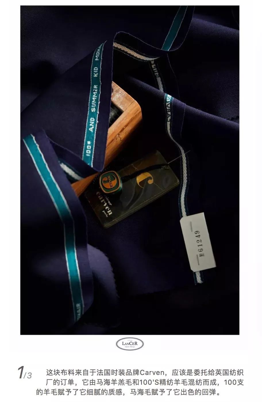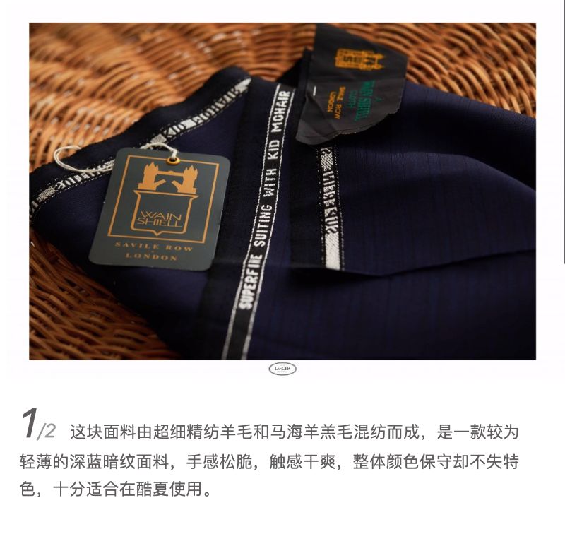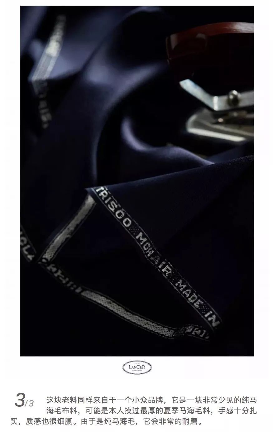 无论老料,还是新料,能碰到百分百马海毛的,有绝大多数可能性都是深色,原因有两个,一:马海毛纤维本身成本就很高,没有面料商愿意冒风险投资浅色的面料,这也因为英国穿衣习惯一直以来以保守见称;二:当时使用马海毛做正式晚礼服比较流行,没有想过挺括扎实的马海毛能成为休闲面料。