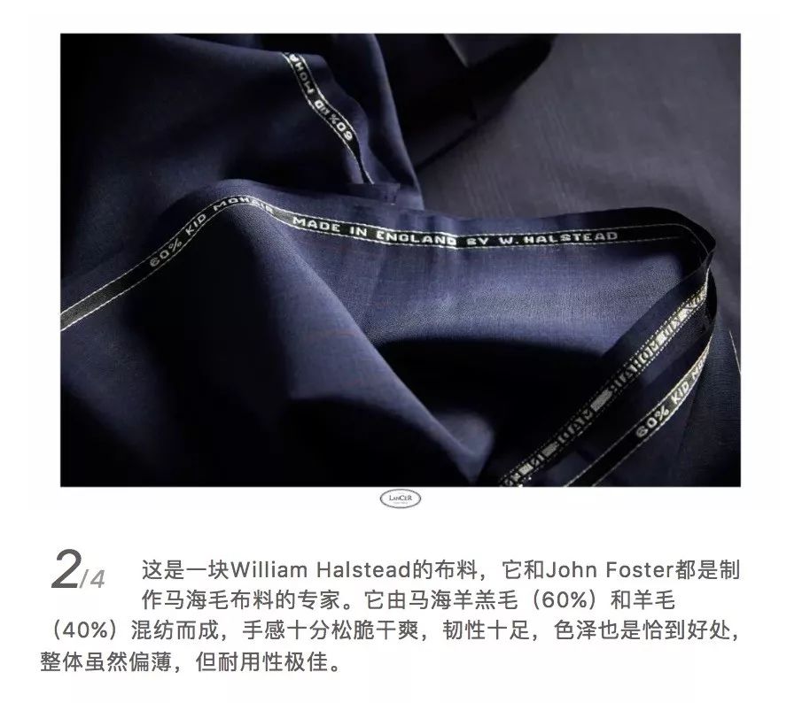 另外在British Mohair的系列里也会看到百分百纯马海毛,手感比马海毛老料更加细腻,这要拜现代的后整理工艺所赐。说起William Halstead,也顺带提一下萨维尔大裁缝专用的Harrison’s。