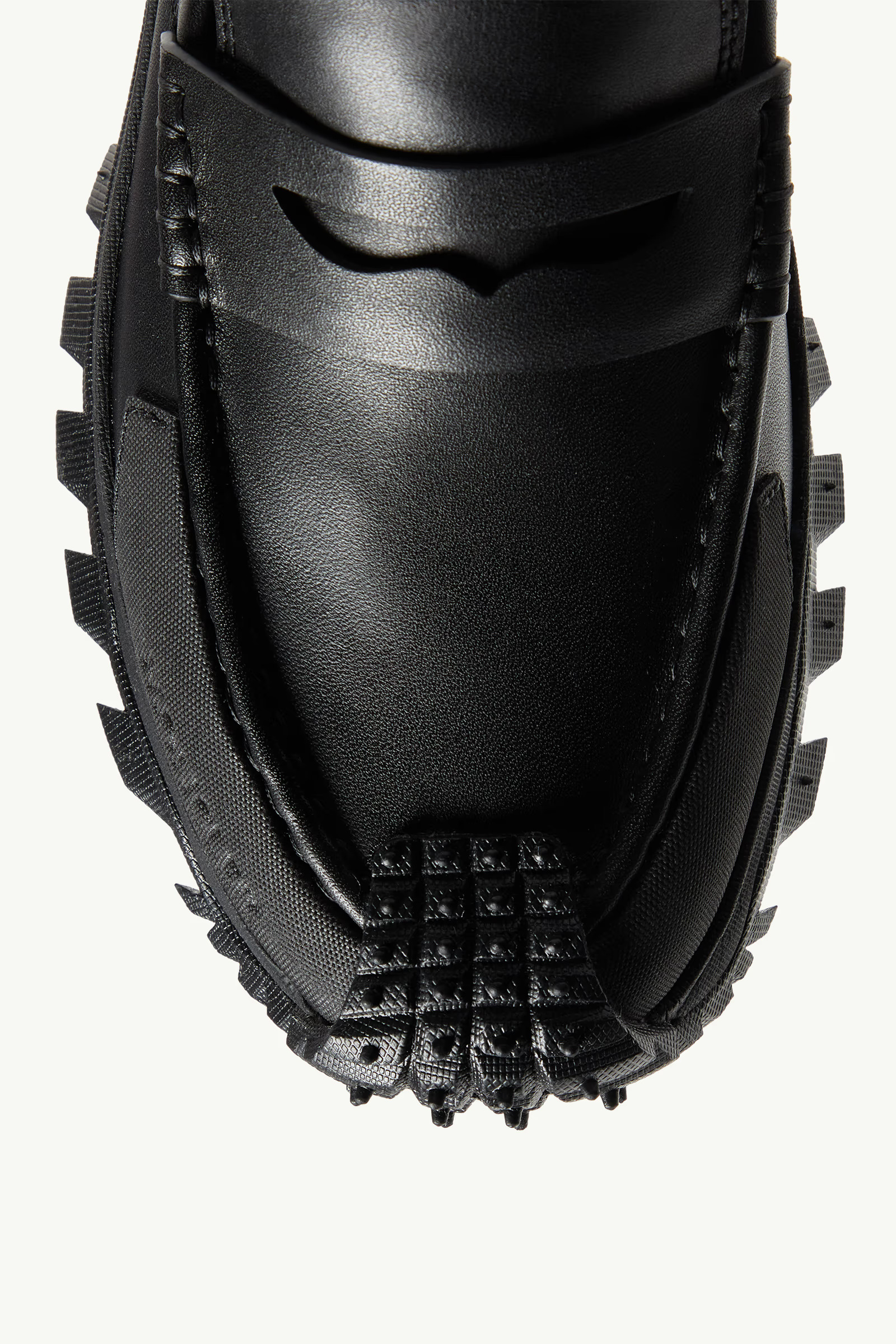 这双全黑乐福鞋乍看极具攻击性:尖锐的 Vibram Megagrip 从鞋底溢出并贯穿鞋面,伴随同样延伸至鞋面的橡胶鞋底。外加科技感十足的 TPU 扰流板和雕塑感空气动力学中底,就得到一款近乎野蛮的鞋款设计。这双厚重而结实的运动鞋,如今已蜕变成一款专为户外设计的柔软皮革乐福鞋。