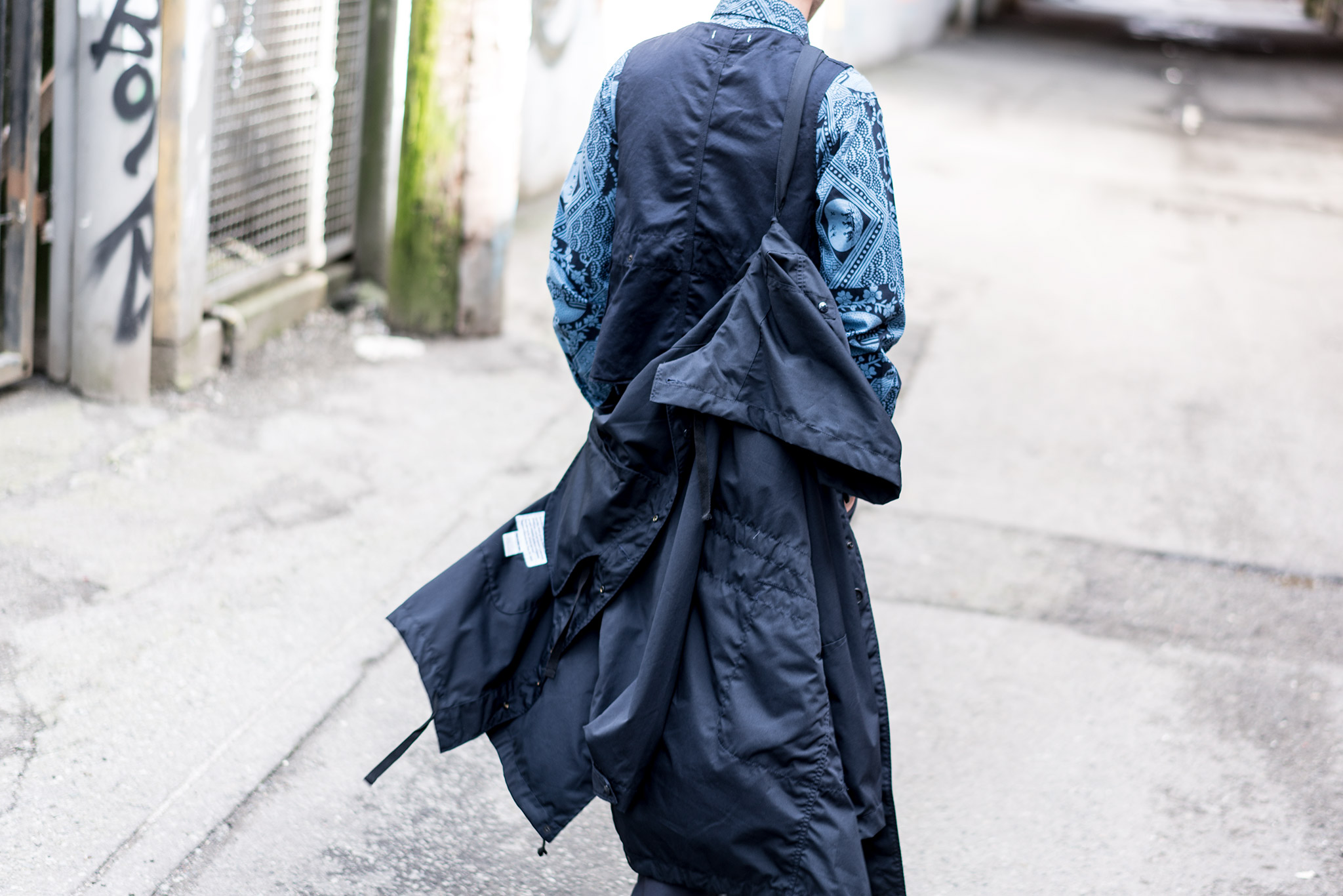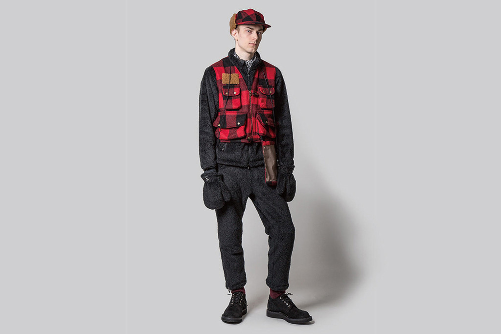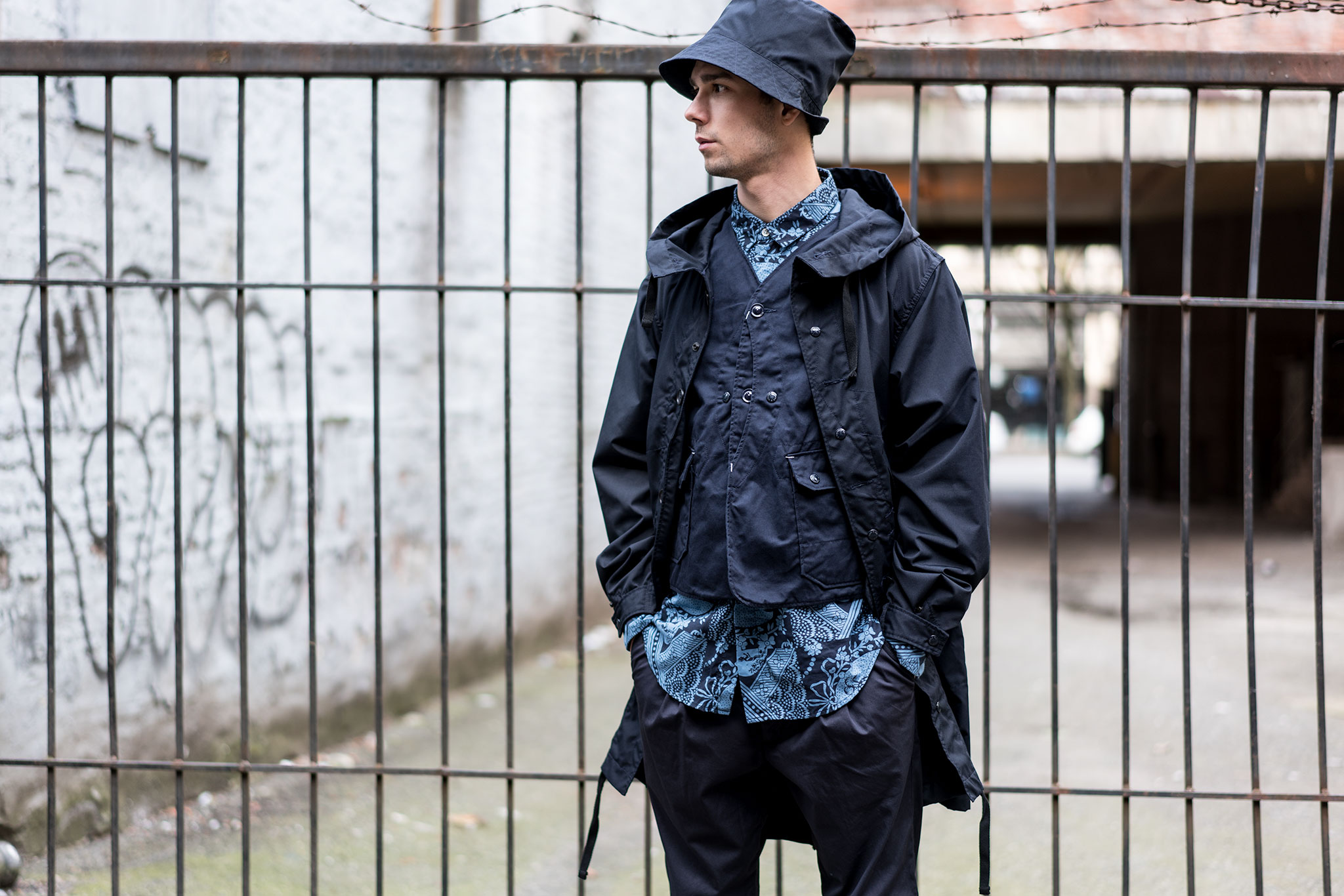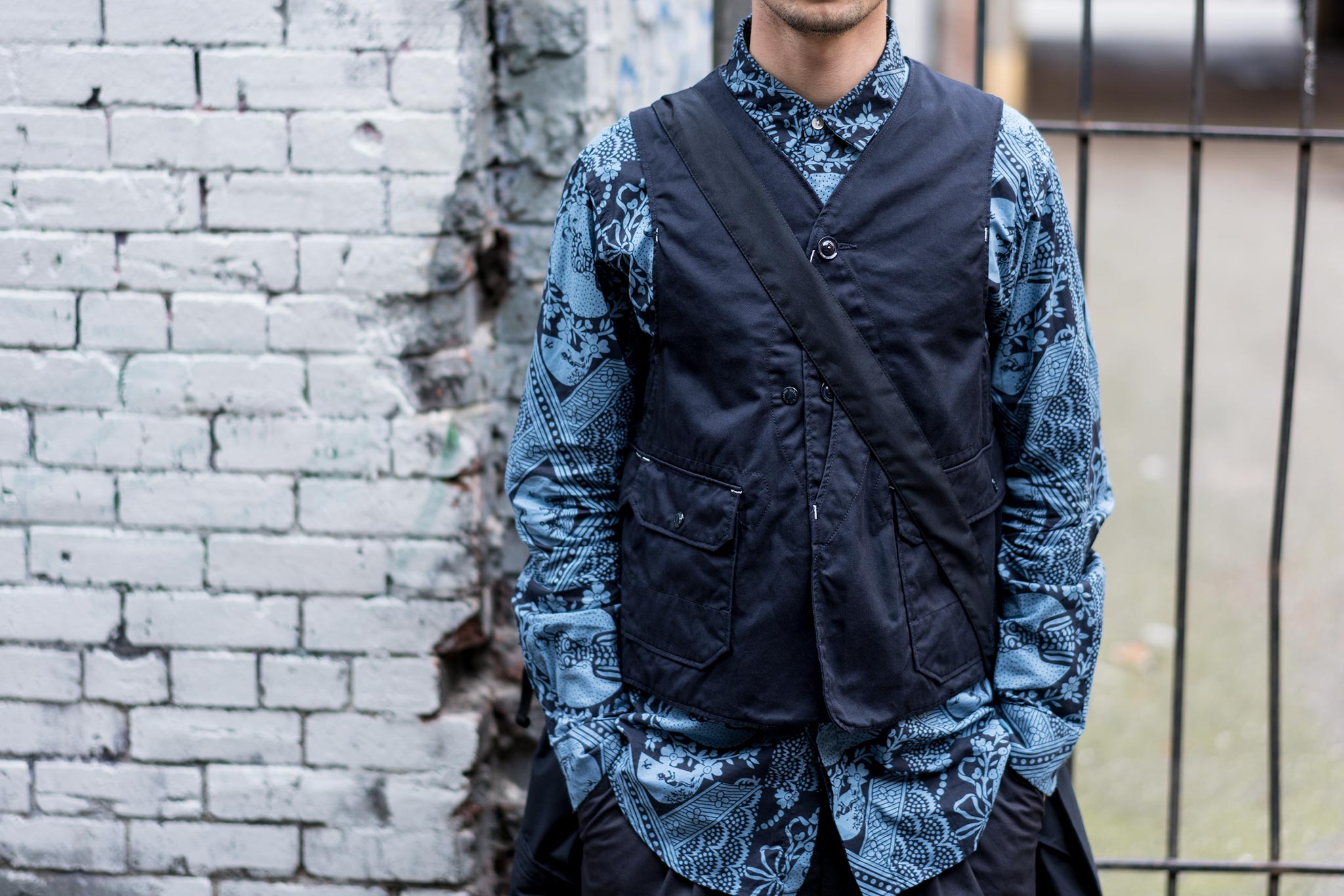 上述这些示范其实够具说服力,仅仅是运用衬衫、外套、T恤基础单品的搭配就巧妙的将“鱼味”去除。在春夏交替时节和夏季这样穿搭不失为一种选择。其实马甲被巧妙的以外套的穿搭方式呈现已不足为奇。东京精品买手店Nepenthes旗下的Engineered Garments就善用以马甲外穿的搭配成为每次品牌对外的宣传构架,“洋葱式”layer和诸多一反常态的搭配思维形成自有特点,Engineered Garments可以是形式上的一个范本。(有可能是最强范本)