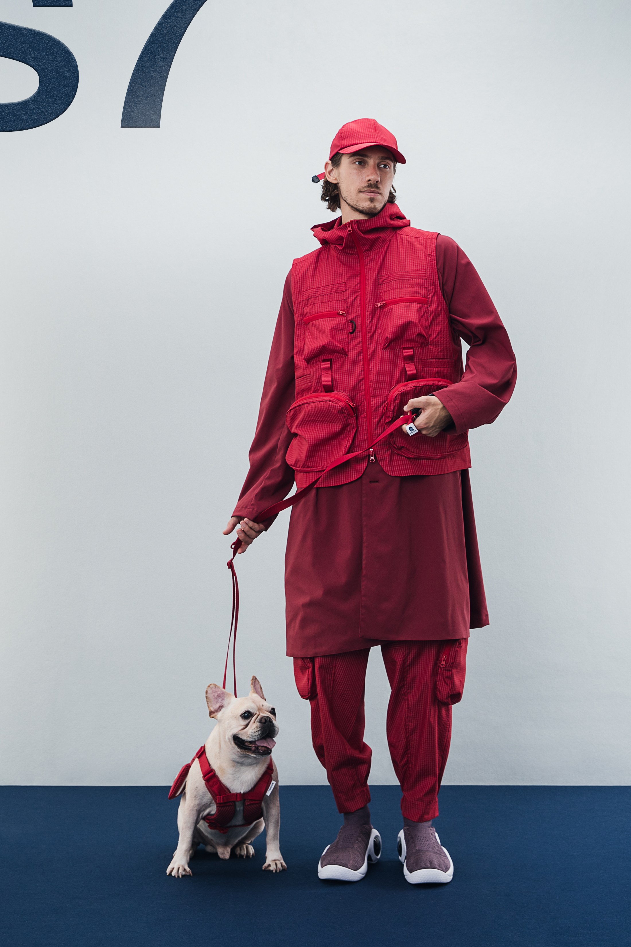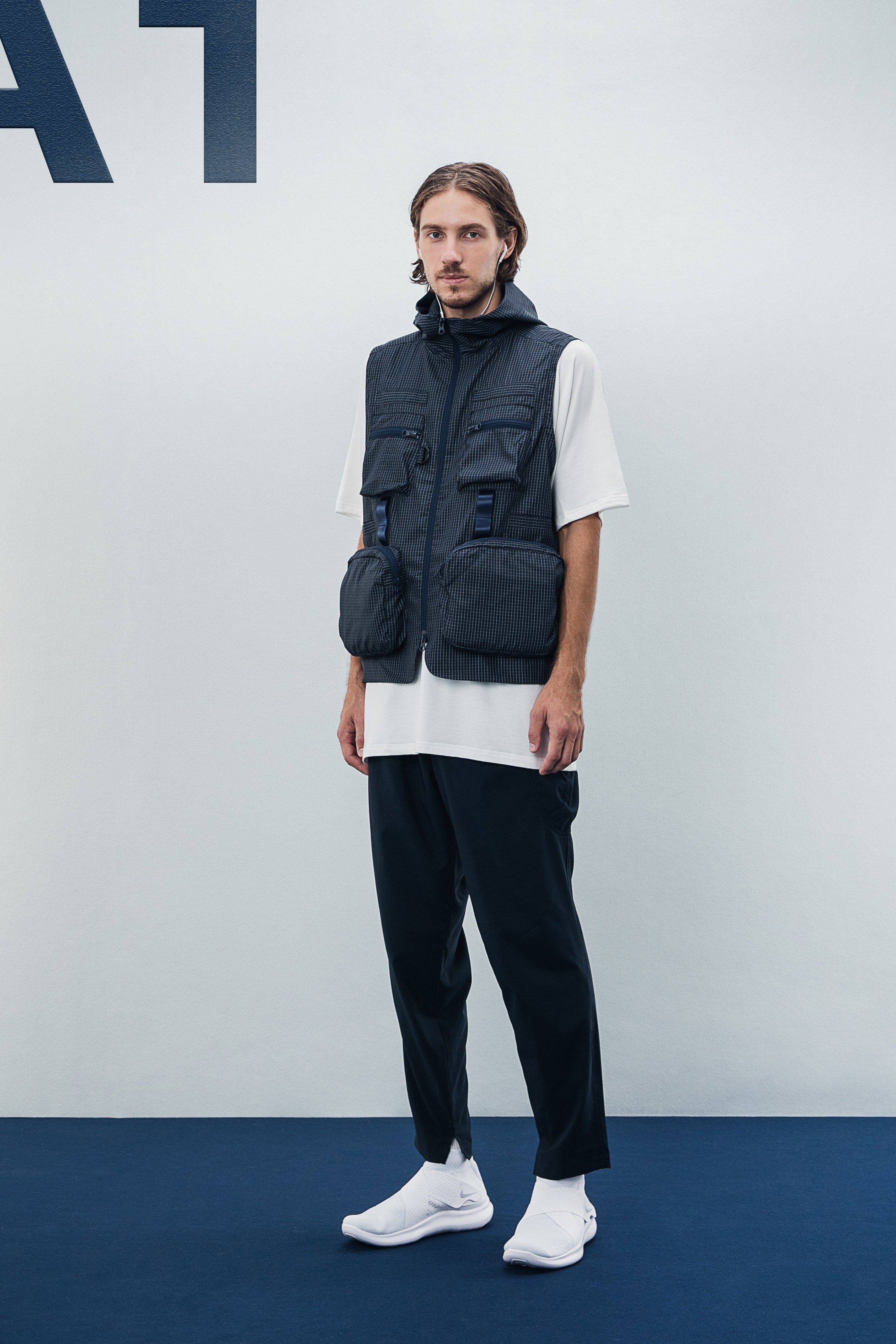 与之散发出的清新之气,有种说不上的高级未来感,但也并未脱离现代审美。连帽马甲和防水风衣的造型令人最为印象深刻,层次不显“累赘”外,马甲的长度不影响到风衣插袋实使用,而与之相呼应的是,每个口袋在生活中都成为了”有用”的设计。除了单品间的长短比例关系,相同材质的运用和碰撞也能提升造型感。