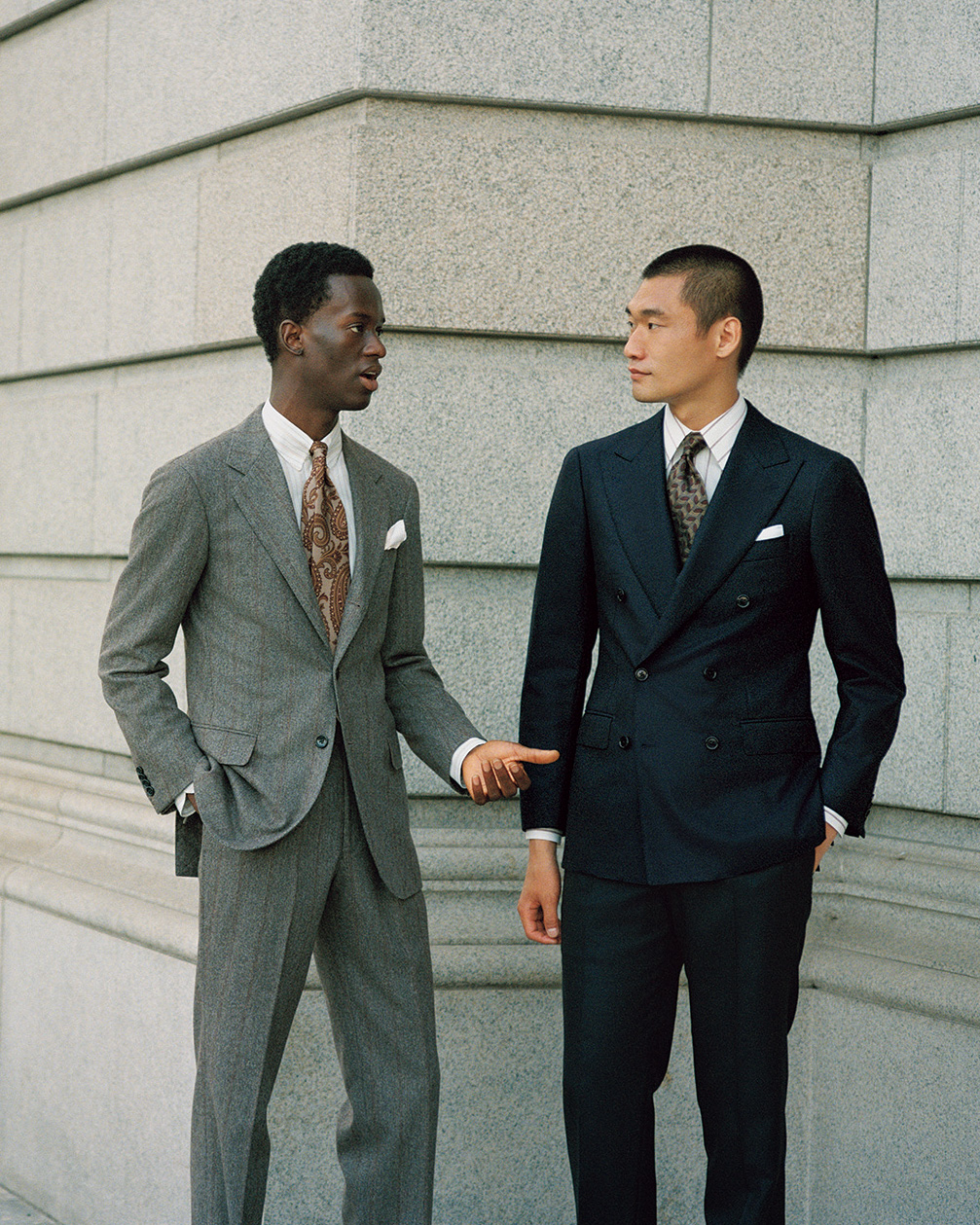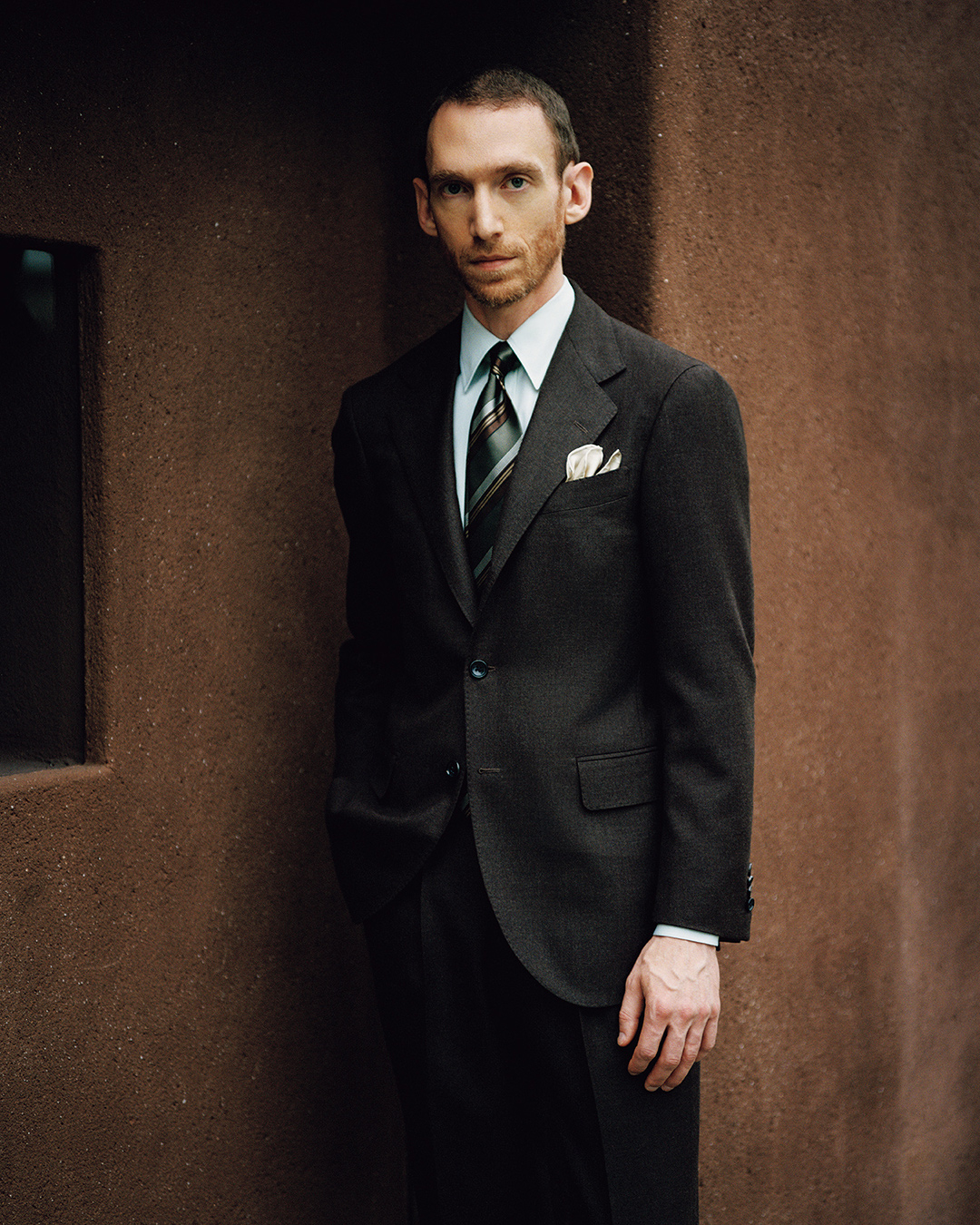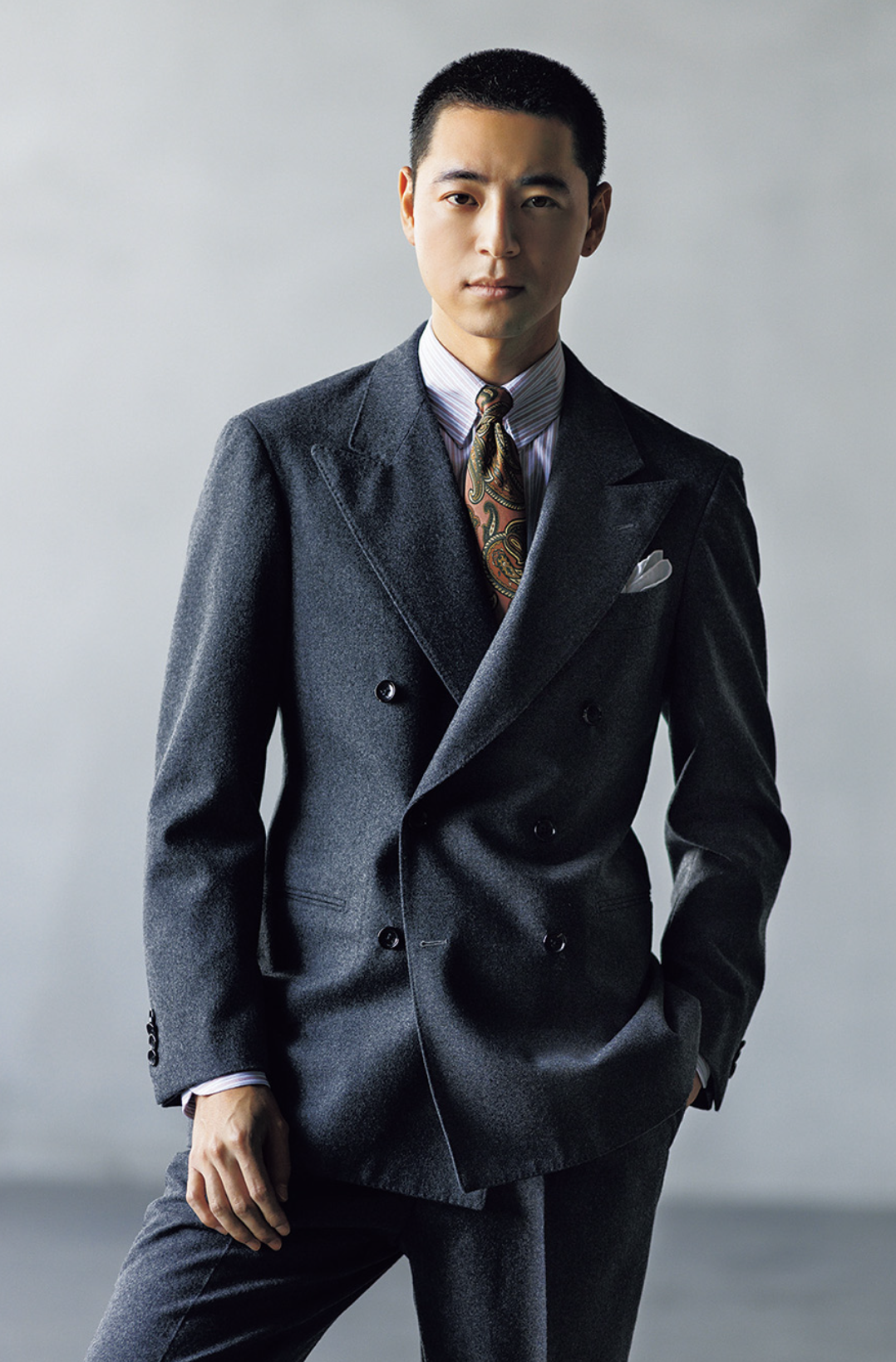 这套造型中,衬衫条纹、领带配色与西装夹克风格相互呼应,营造出独特的温度感,更适合有一定生活阅历的男士。BEAMS F 衬衫贴合亚洲体型,粉色条纹优美又温柔;ATTO VANNUCCI 领带的提花设计,巧妙点缀胸前细节;PAOLO ALBIZZATI 口袋巾印有小花图案,既与领带提花形成呼应,又不失优雅质感。